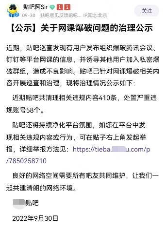 今年9月,“网课爆破”事件频发,各方主体很快采取相应行动。比如9月6日,某网课常用平台在其官方公众号发布文章《共同关注!在线课堂“防破”指南》,指导使用者如何及时阻止网课入侵。9月30日,某平台打击“网课爆破”相关违规内容和账号,并鼓励网友积极举报。