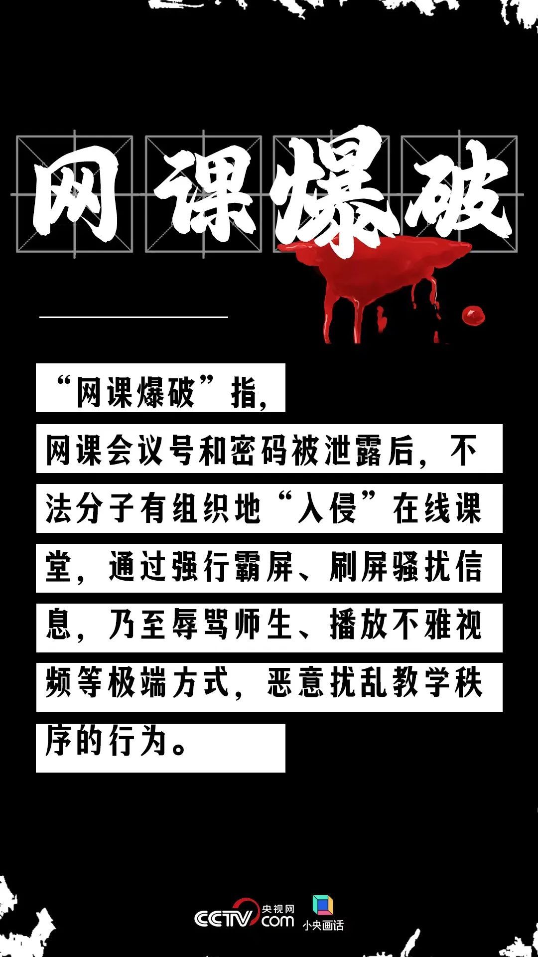 “网课爆破”指,网课参与者泄露网课会议号和密码,随后不法分子有组织地“入侵”在线课堂,通过强行霸屏、刷屏骚扰信息,乃至辱骂师生、播放不雅视频等极端方式,恶意扰乱教学秩序的行为。