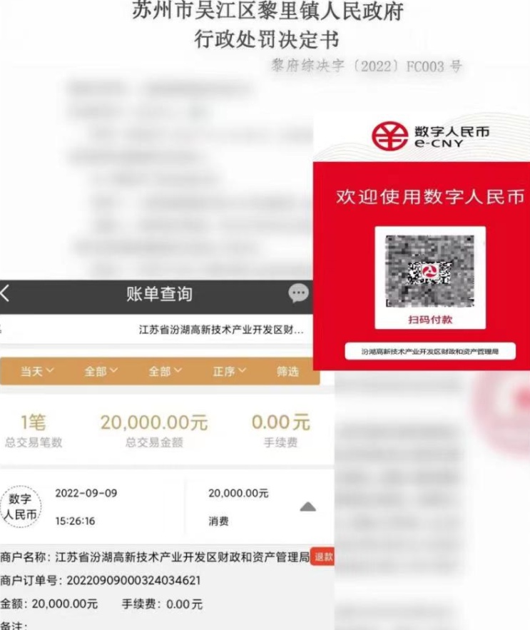 近日,吴江汾湖高新区财政和资产管理局通过对公数字人民币钱包实现了首单行政处罚罚没款数字人民币跨区域支付落地。工商银行上海市分行和苏州市分行协同联动,实现了苏州市分行下属网点对上海地区交通罚没款数字人民币缴纳业务落地。在成功验证后,迅速推广并实现公安罚没收入、海关罚没收入等34项罚没收入跨区域数字人民币支付的全覆盖。行政罚没领域数字人民币支付的成功落地,切实方便了缴款人的支付行为,有效提升了罚没款收缴的便捷性及行政执法效率。