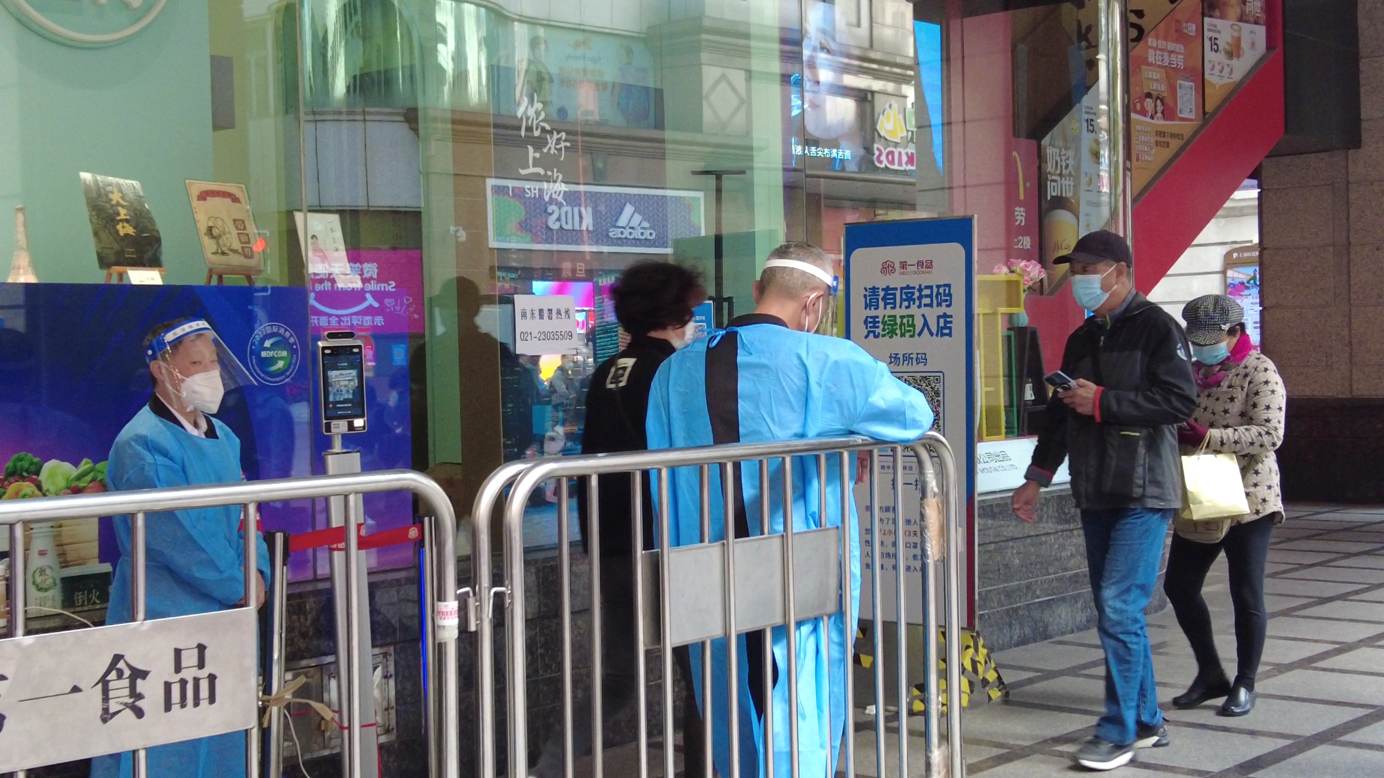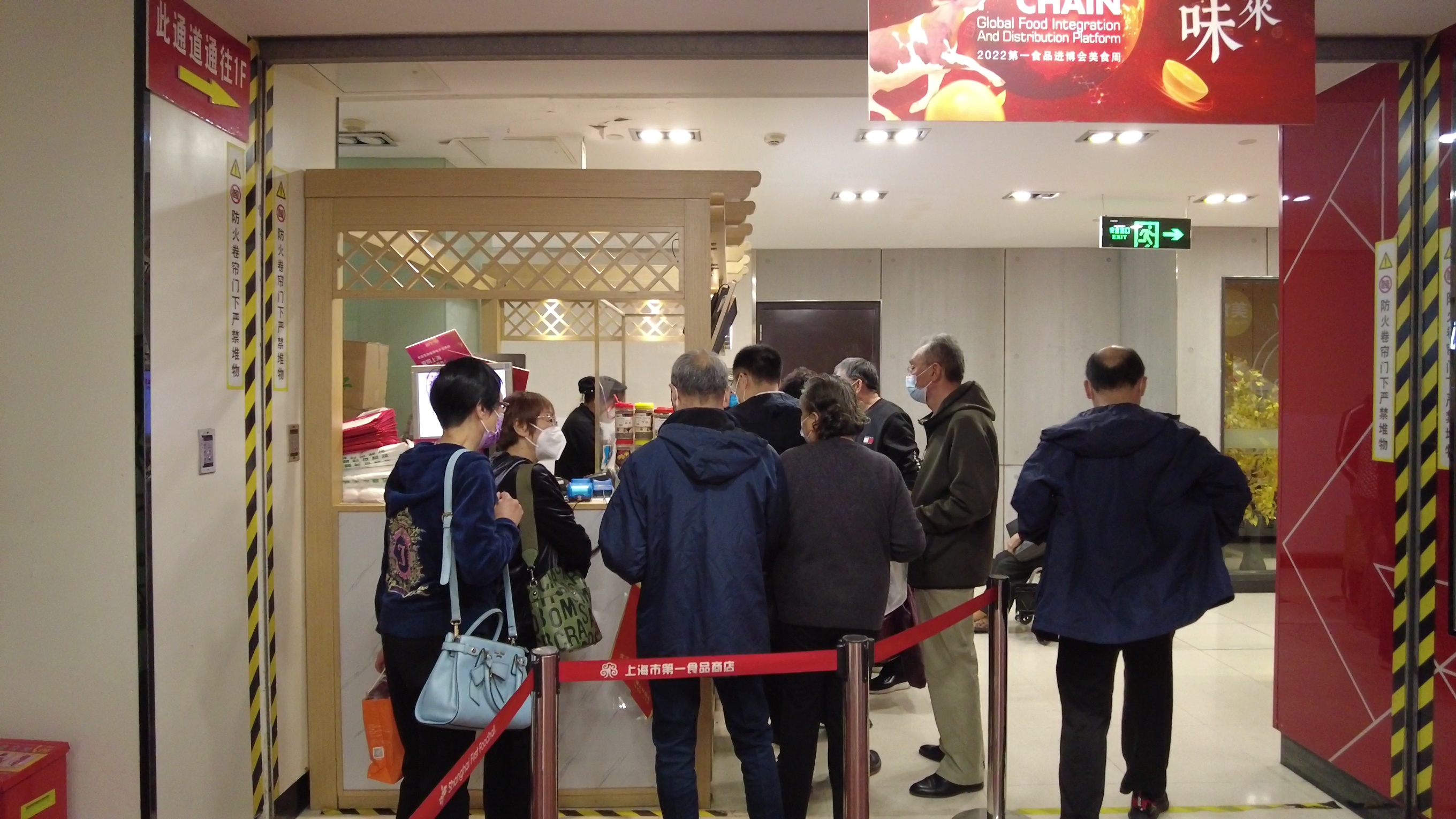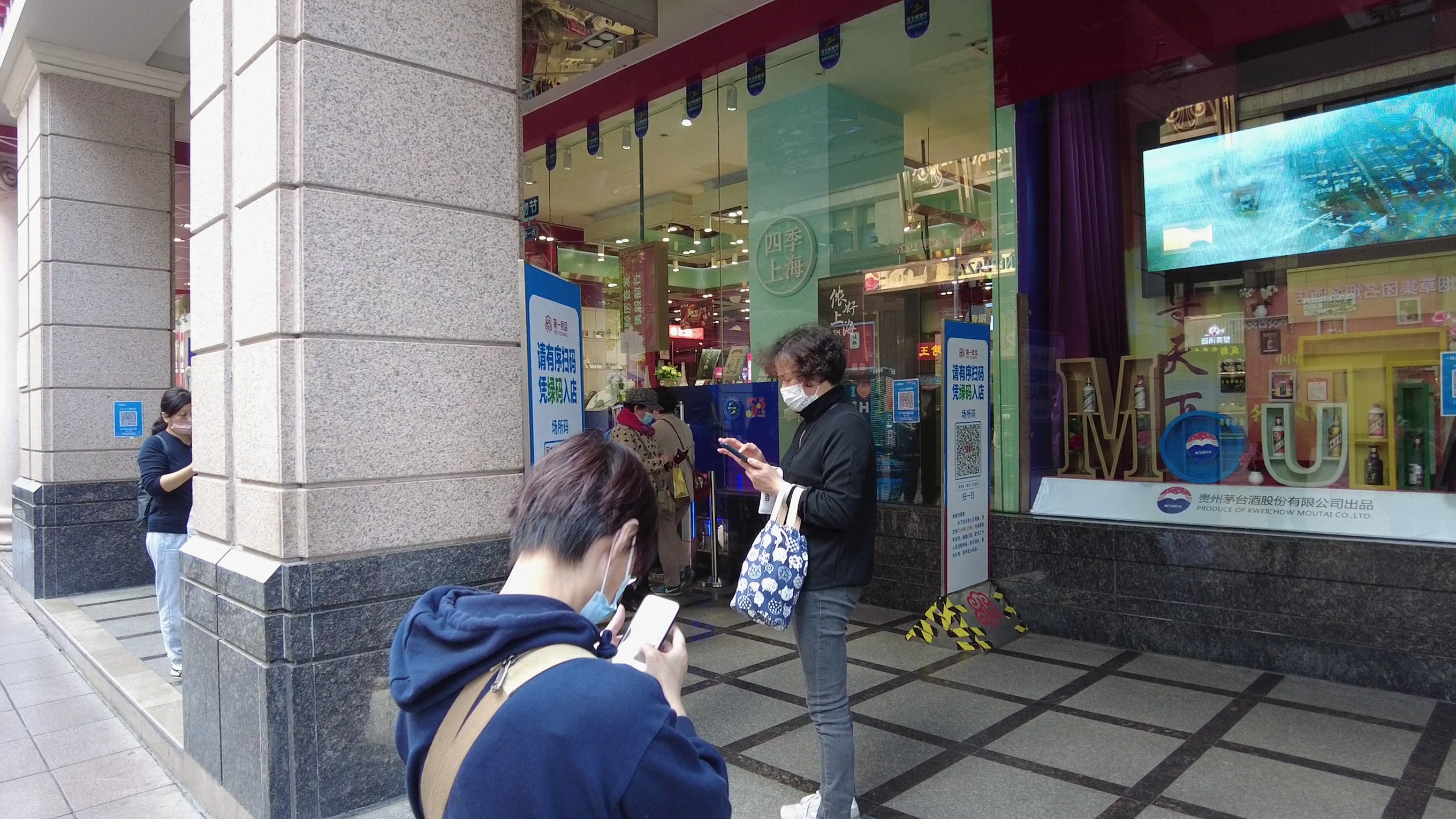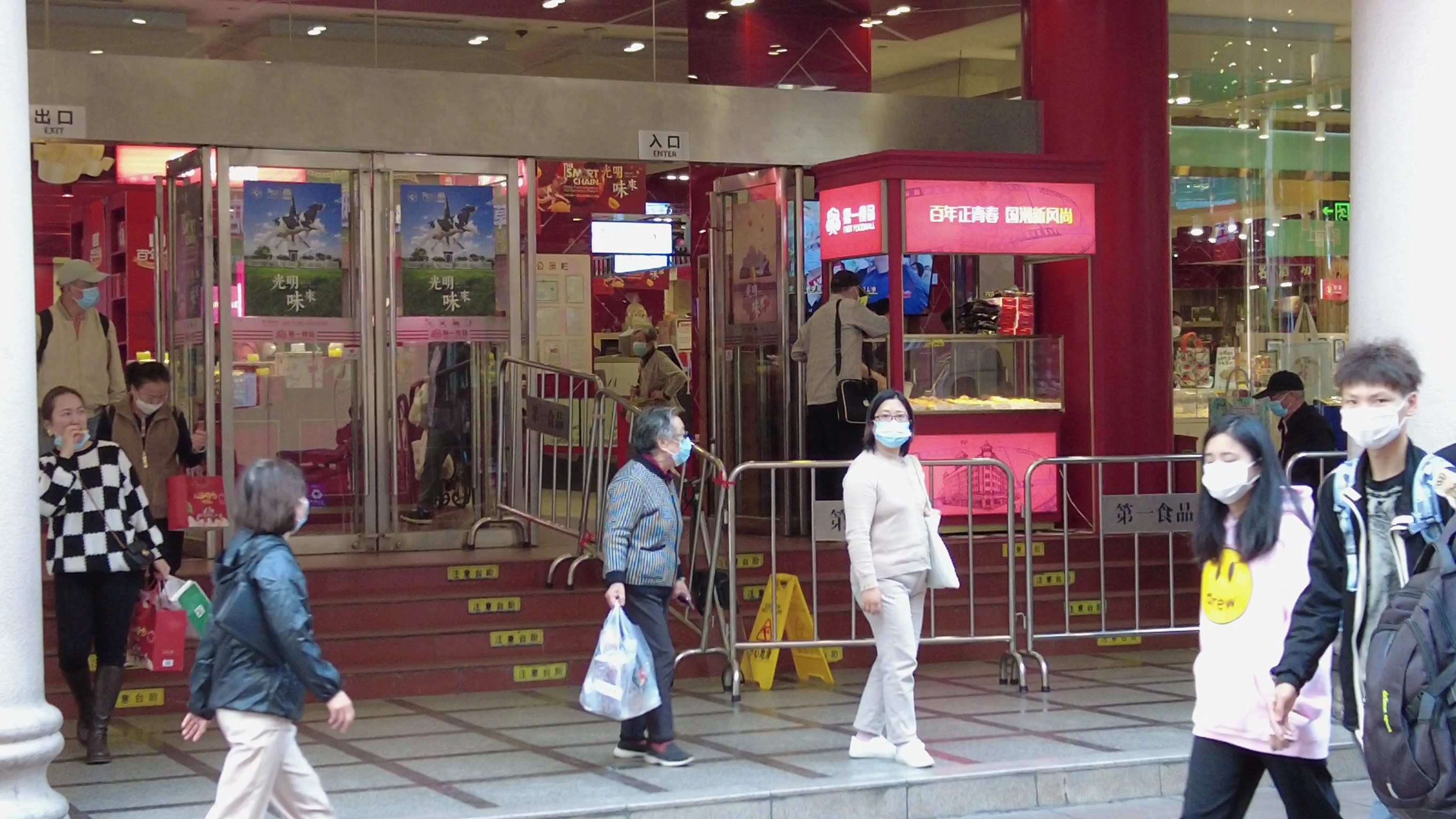 今天上午10点,记者来到位于南京路步行街上的第一食品商店,商店的大门口一切如常,不断有市民从蛇形通道进入,在入口处,有专门的工作人员提醒市民扫码并进行查验。而进入的市民也都十分配合,主动出示场所码,并且规范佩戴口罩。