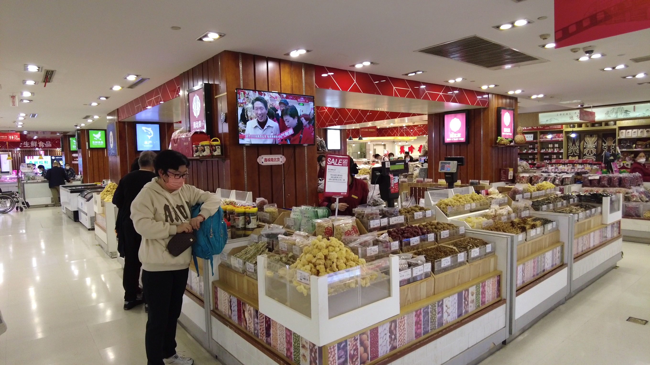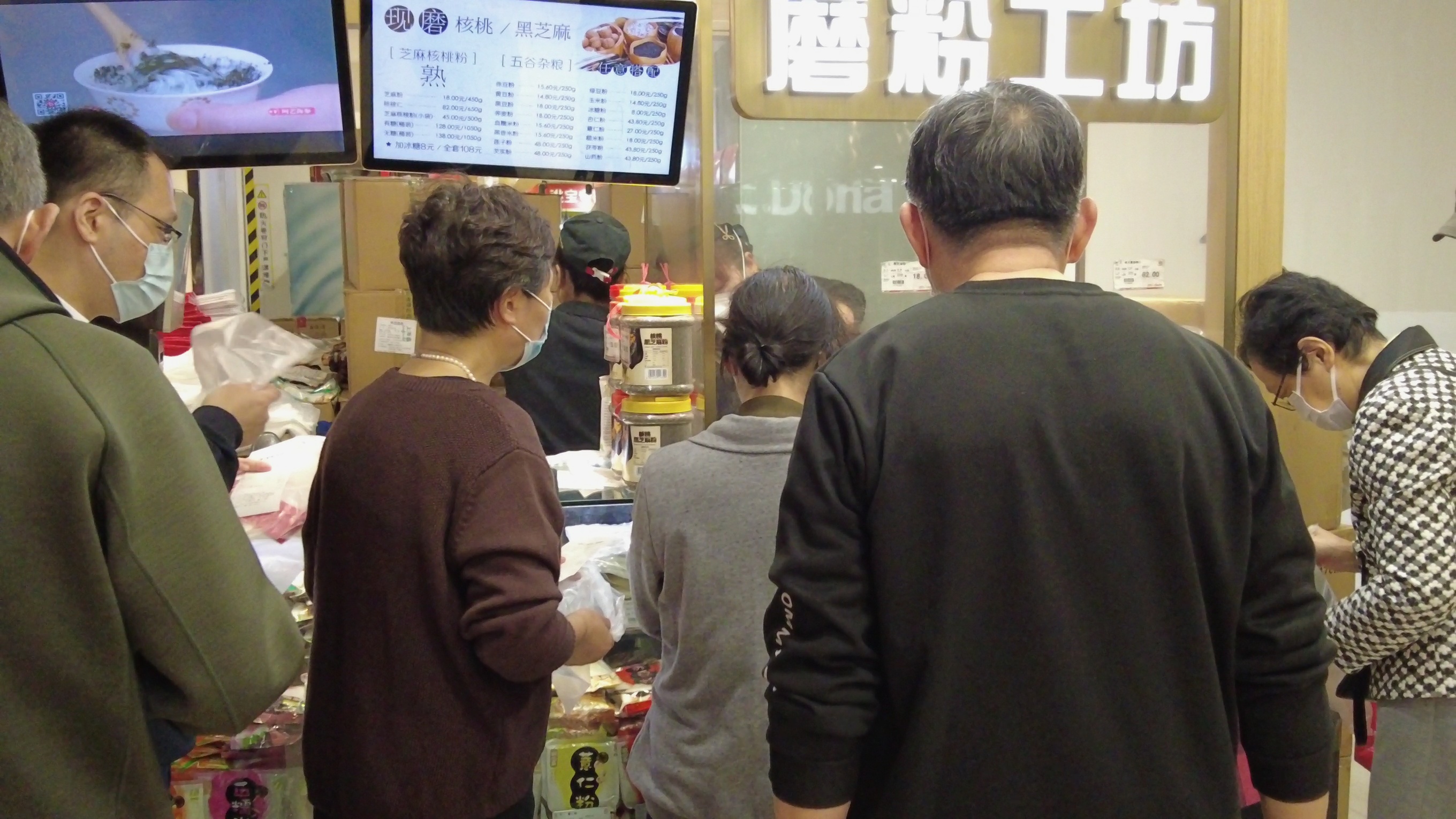 在两楼销售芝麻核桃柜台,市民瞿先生正在排队购买芝麻核桃粉。瞿先生介绍,昨天有看到网上传食品一店关门的消息,今天路过,看到一切如常,便想着进来采购些食品。立冬已过,冬令进补必须提上日程,而每年天冷的时候,芝麻核桃都是家里必备的进补佳品,所以今天路过,就特地来买上一些。