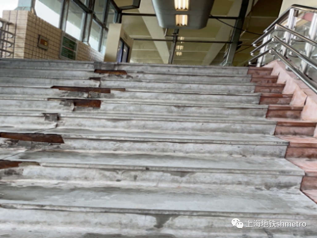 上海地铁1号线共康路站自2004年北延伸开通至今,运营已有18年。随着使用年份的增长、客流的日益攀升、长期的日晒雨淋等诸多因素,车站南北站厅四部楼梯表面的防滑层已有不同程度的损坏,对乘客通行造成了一定的影响。
