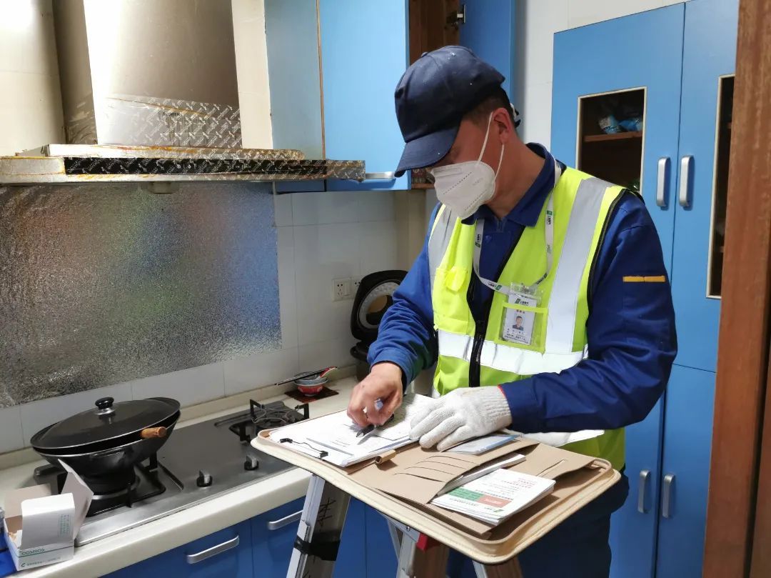 在华浜新村,安装人员正在给各户居民家庭安装报警器。燃气报警器安装完成后,燃气公司的安装人员还会免费为居民家庭全面检查燃气管道、热水器、燃气灶等设施的安全状况,确保无泄漏。