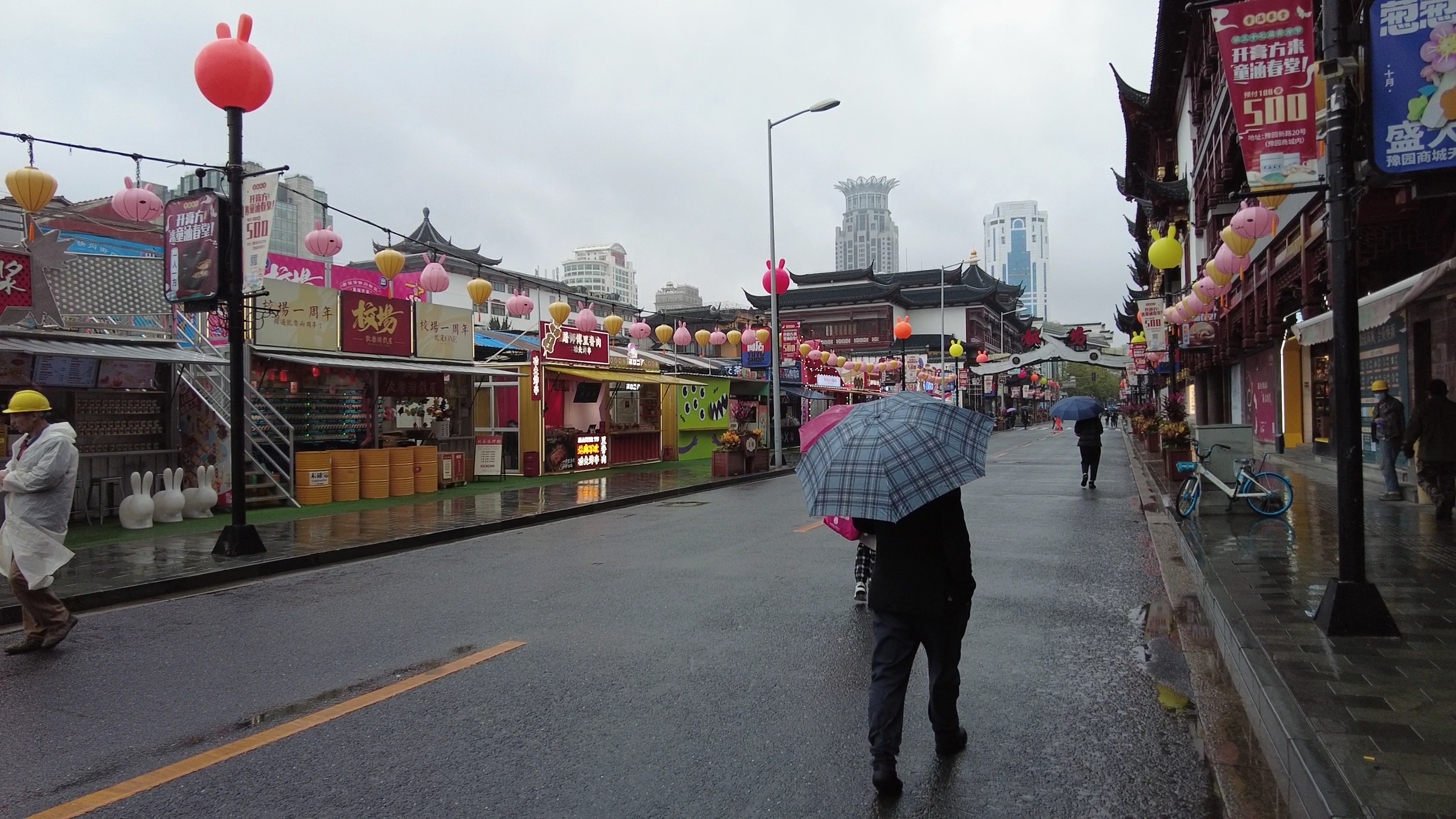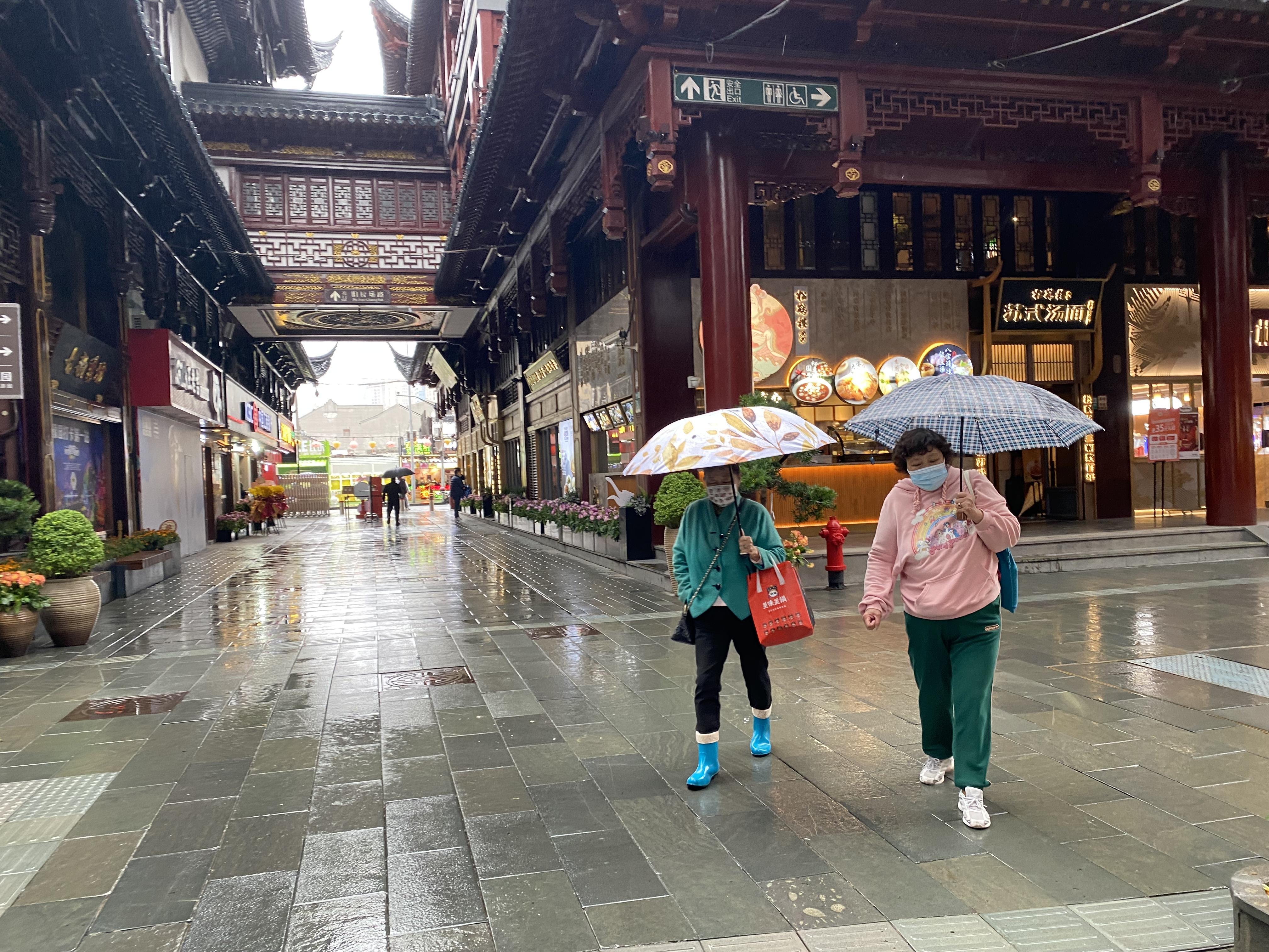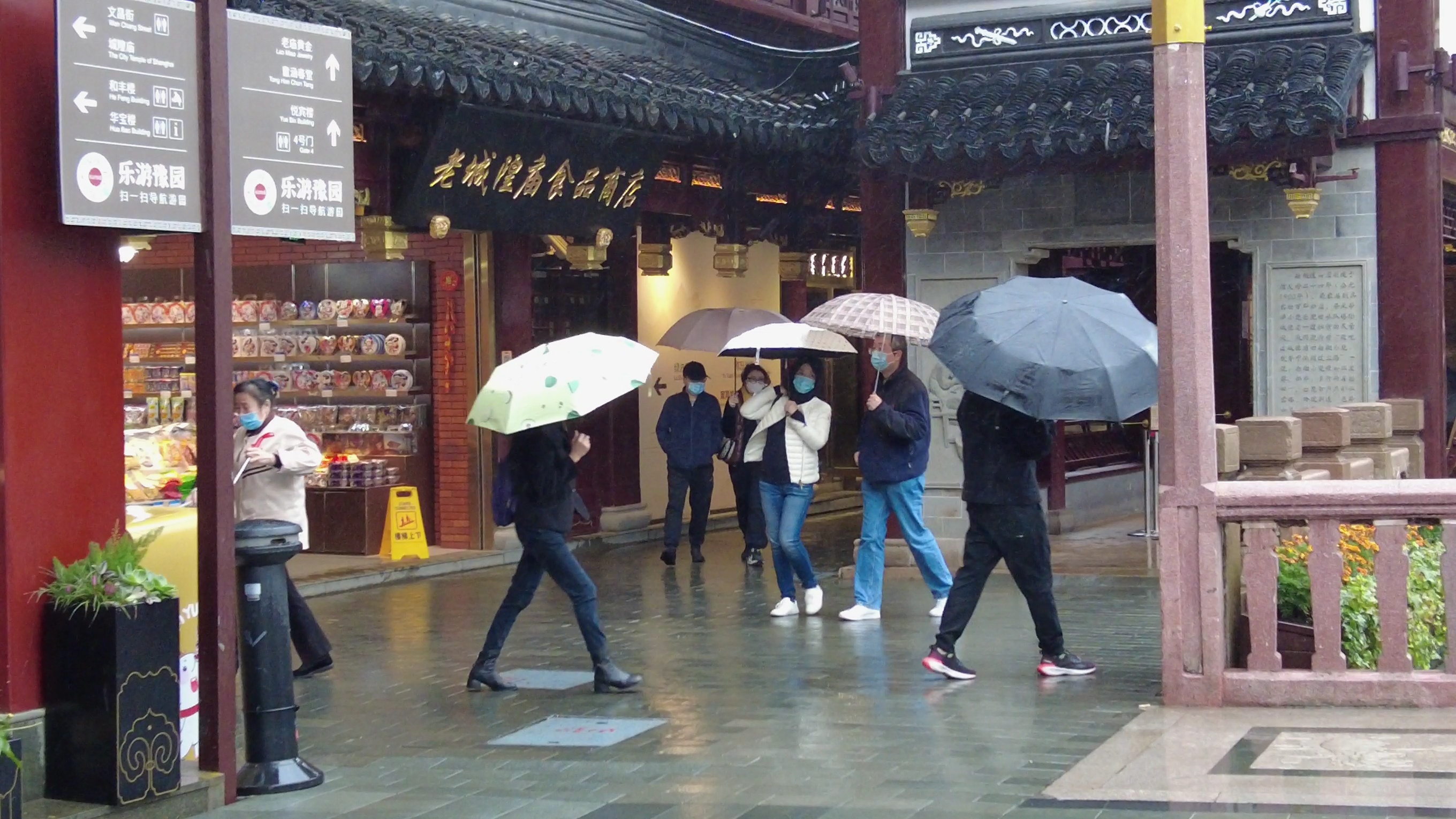 中午时分, 市中心豫园商城里头显得有些冷清,因为下雨的关系,平日里最热闹的九曲桥上,只有三两个打着伞的市民在观光拍照。