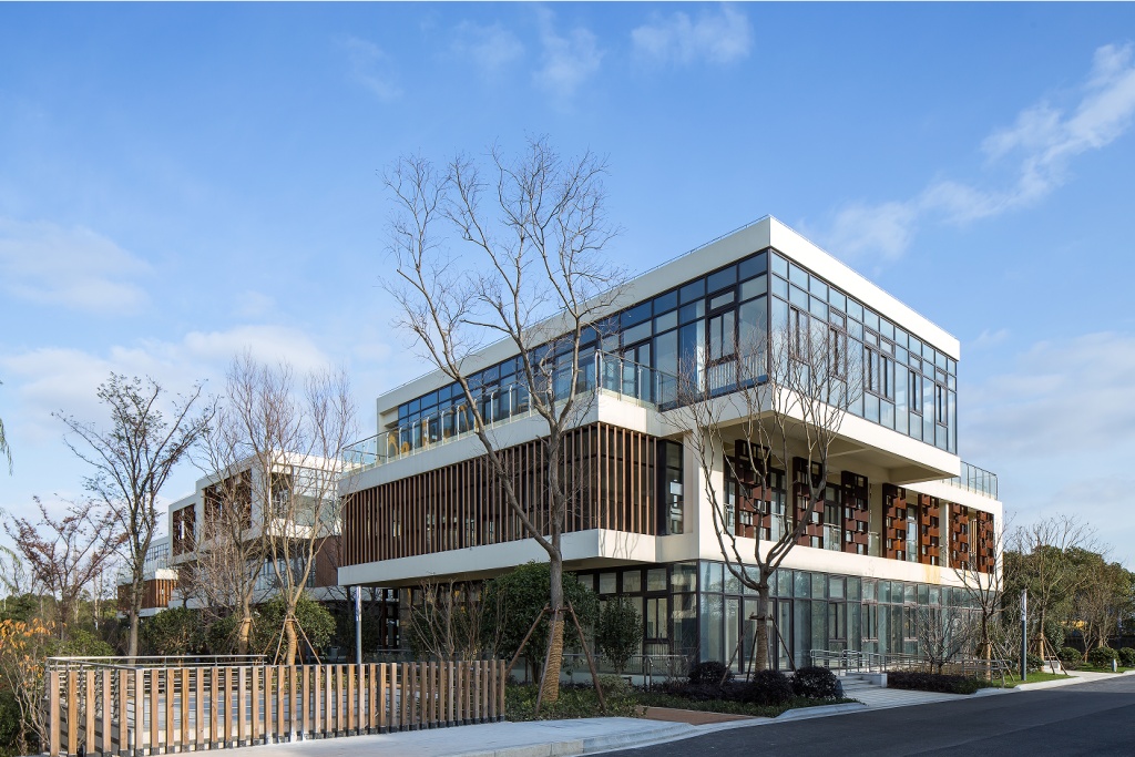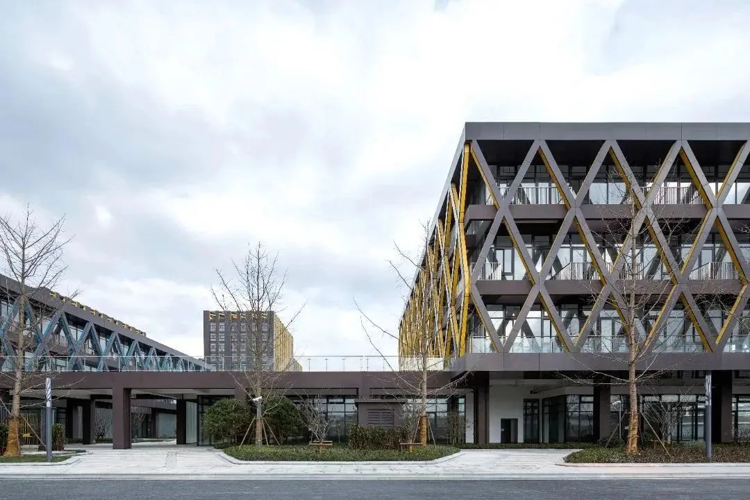 园区建筑群体以红、黄、蓝三色为主调,立面采用实体和玻璃穿插,节能环保;在整体规划上,采用“聚落”这个概念,运用空间、当地建造的材料和方法,与自然景观产生互动,园区还布置了多个运动场所,动静结合,强调自然生活工作状态,最终形成现在集时尚展示、研发、办公等于一体的现代化、花园式产业园区。
