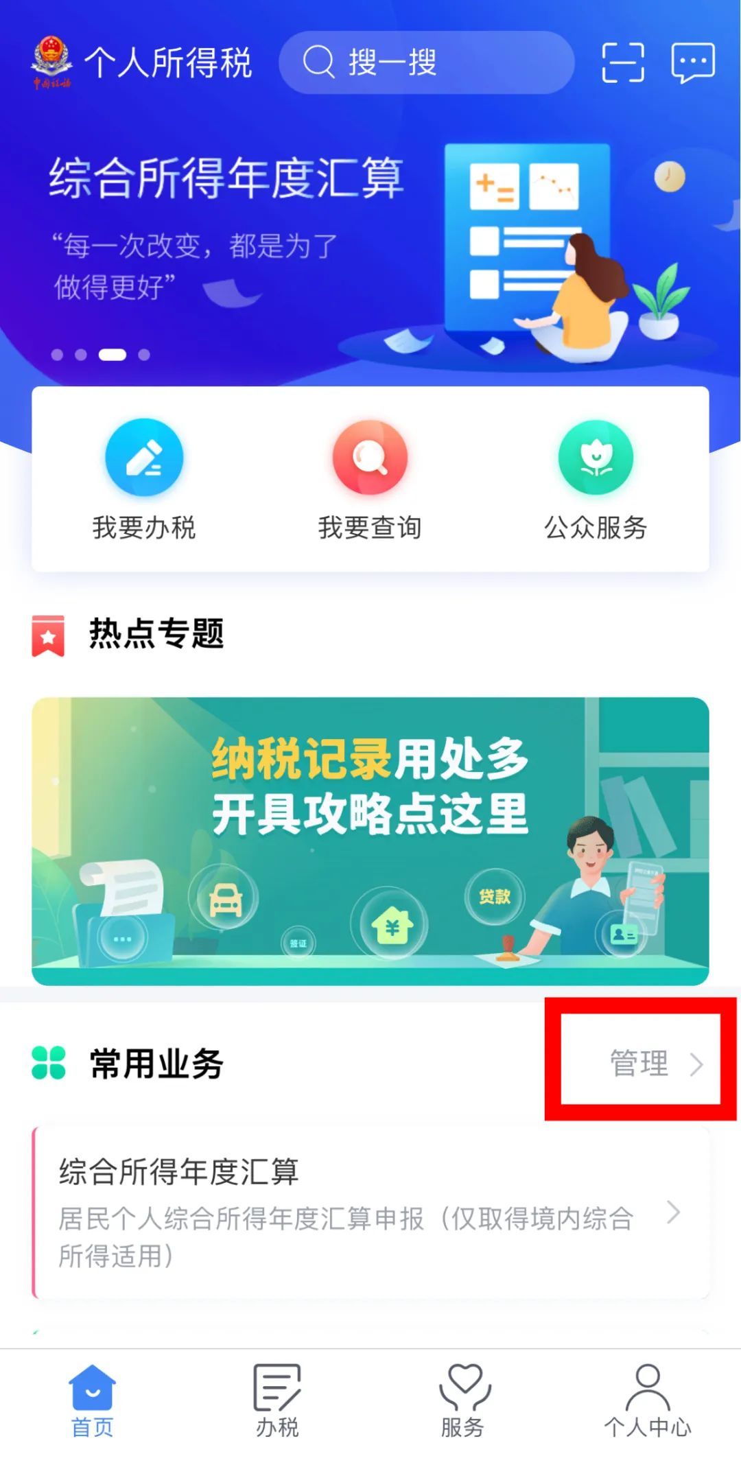 打开个税APP,点击常用业务的“管理”