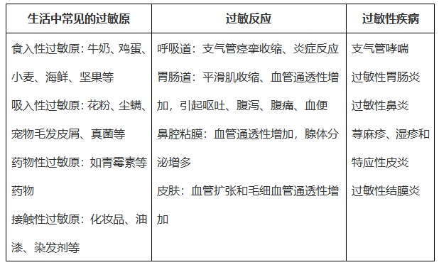 过敏严重时可出现过敏性休克,表现为皮肤潮红、瘙痒,继而广泛的荨麻疹和(或)血管神经性水肿;可因喉头水肿引起的声音嘶哑、喘鸣、呼吸急促、呼吸困难,甚至青紫;还可出现面色苍白、皮肤湿冷、出冷汗、意识模糊等情况,此时应第一时间到附近的医疗机构的急诊就诊处置。