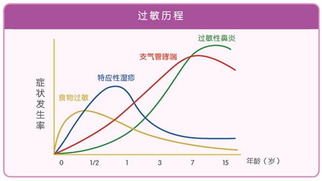 过敏性疾病在不同年龄的儿童中表现类型有所不同,从出生不久食物过敏相关的呕吐、腹泻、便血,婴儿期出现皮肤过敏相关的湿疹,随着年龄增大出现过敏性鼻炎、支气管哮喘等,这个变化过程也称作过敏历程。