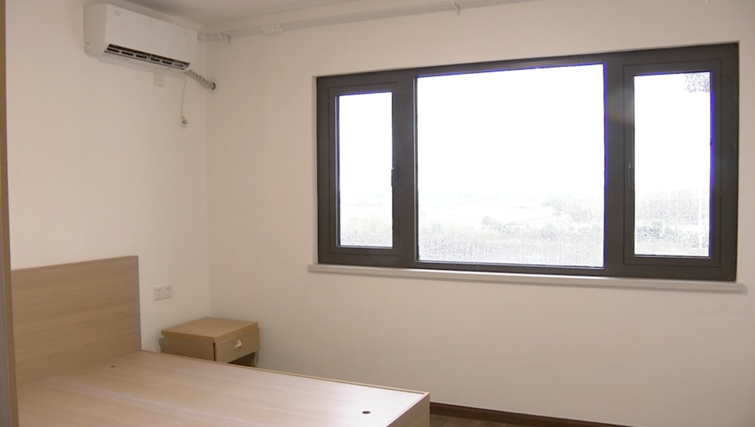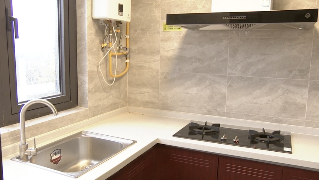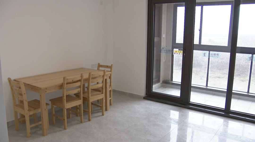 记者来到一套三复四房型,楼下为厨房、餐客厅、卫生间,配备了燃气灶、淋浴设备,客餐厅配备了桌椅,屋内还有可视对讲系统、红外线入侵探测器,让居住更有安全感。二楼有两个房间,配备了空调、衣柜、床头柜等简易家具,基本可实现拎包入住。