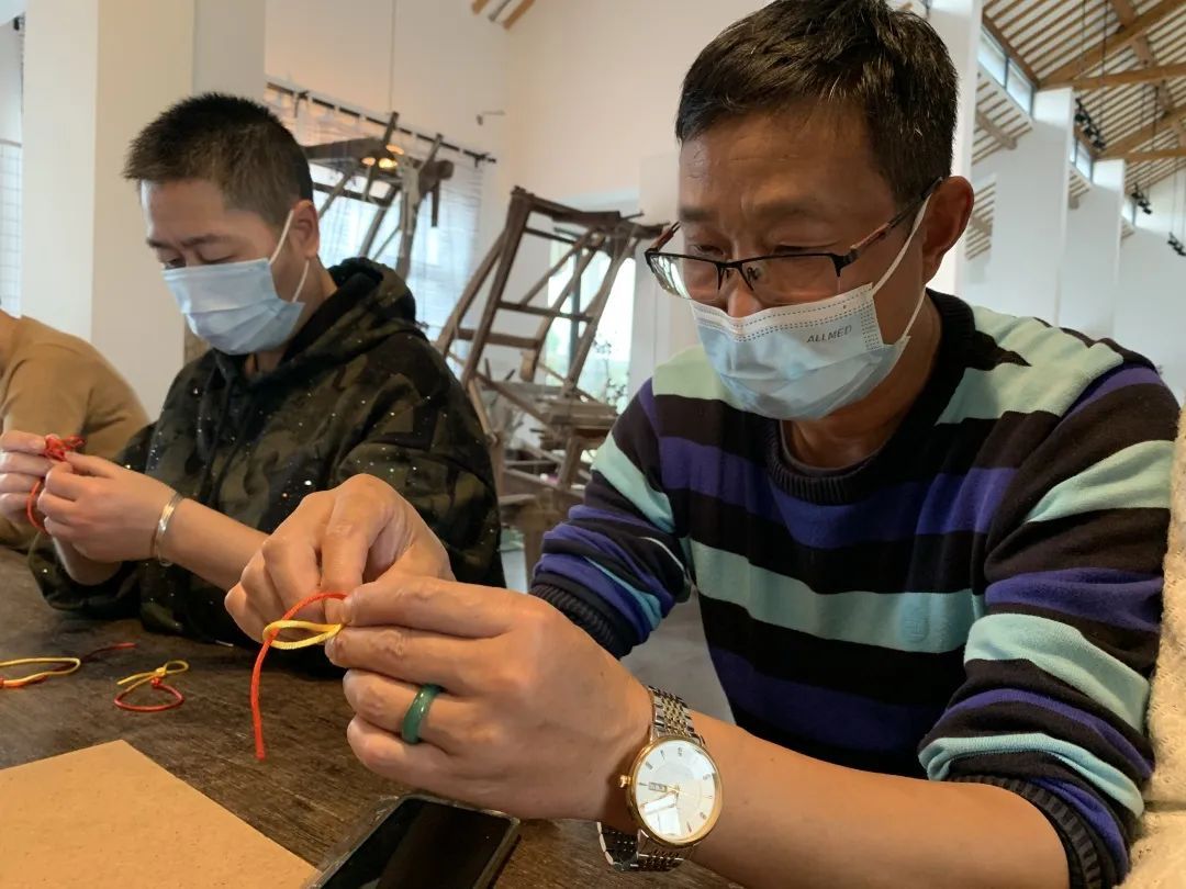 红色的丝绳在指尖翻飞,几分钟之后,一枚花生米大小的红色盘扣就诞生了。这样的盘扣,老刘一个下午可以编出数十枚,在小组集体的“年终作业”——两千多枚盘扣贴成的五星红旗中,他贡献了200多枚。