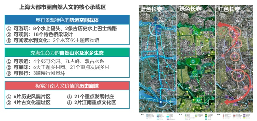 通过深度挖掘历史和文化价值,形成红色长卷。以特色产业为核心的乡村集群带动郊野地区发展。以青浦区重固镇的章堰村为例,曾有“金章堰、银重固”之称,规划打造青东郊野文化新名片,成为诠释上海之根和文化延续的新内核。形成四大遗址簇群,传承历史记忆,展现一幅江南文化的博览长卷。青龙遗址通过“遗迹保护+旅游开发”开发模式,在保护的基础上,结合海丝小镇打造,再现古时青龙港的繁华。