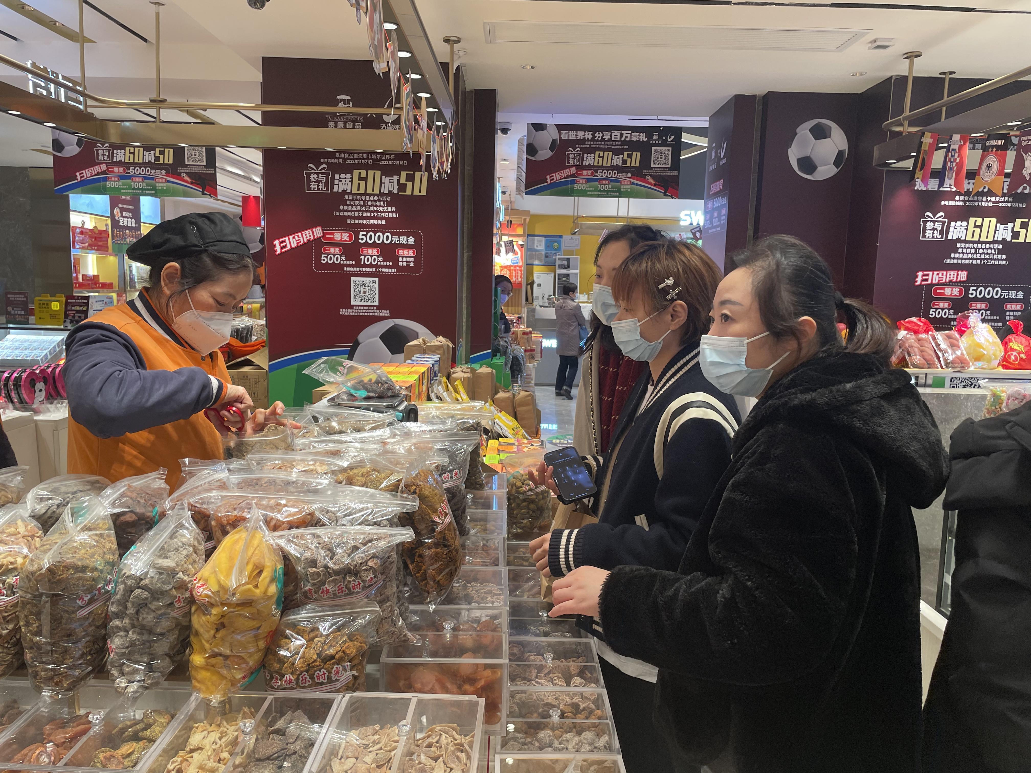 店内,不少消费者正在选购商品。在附近上班的市民俞先生告诉记者:“最近每天熬夜看球,晚上容易饿。前两天看到这里有满减活动,顺手就注册了下,今天发现优惠券到账了,就过来买买买。这里的炒货和熟菜品质都不错,用了优惠券性价比更高。”