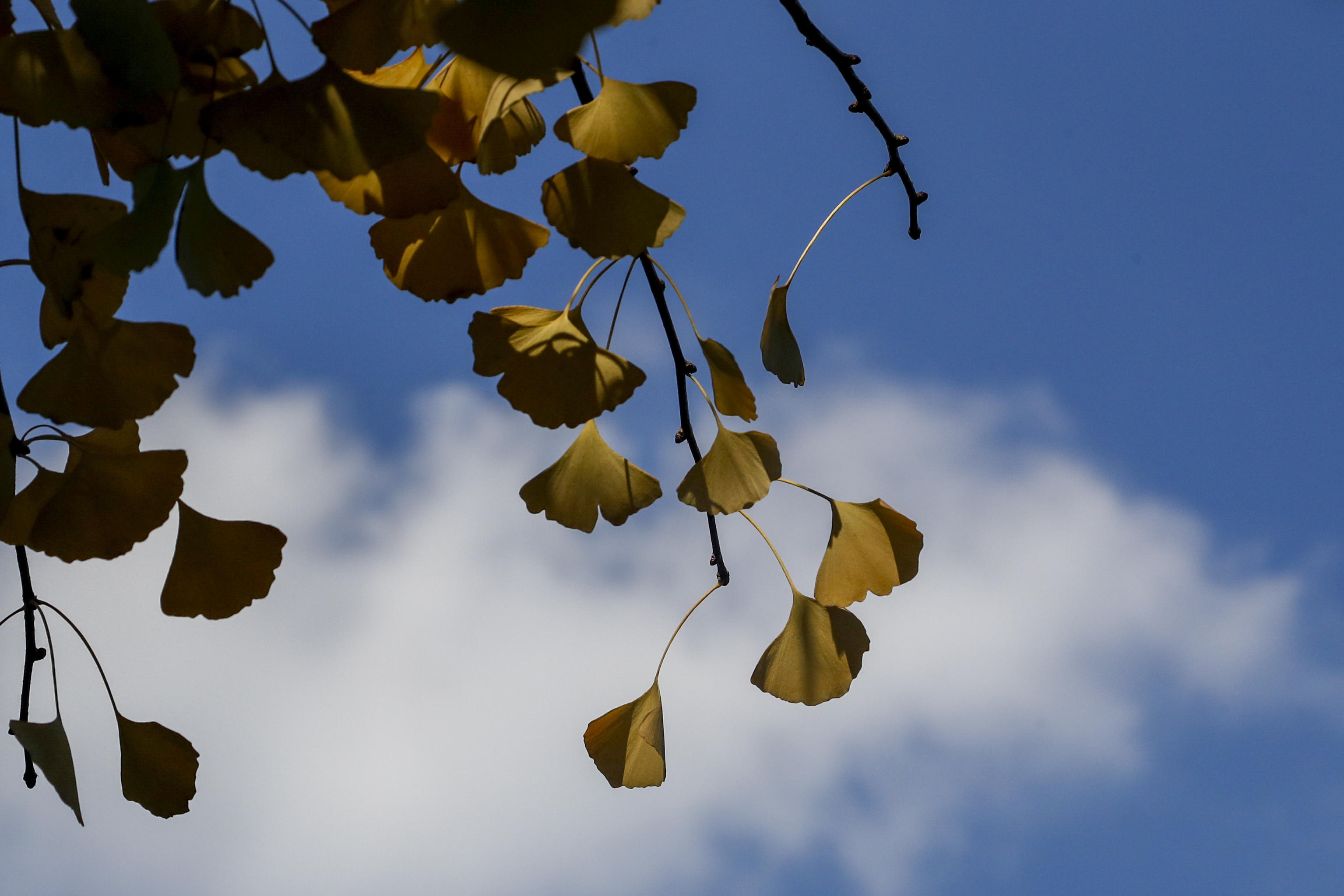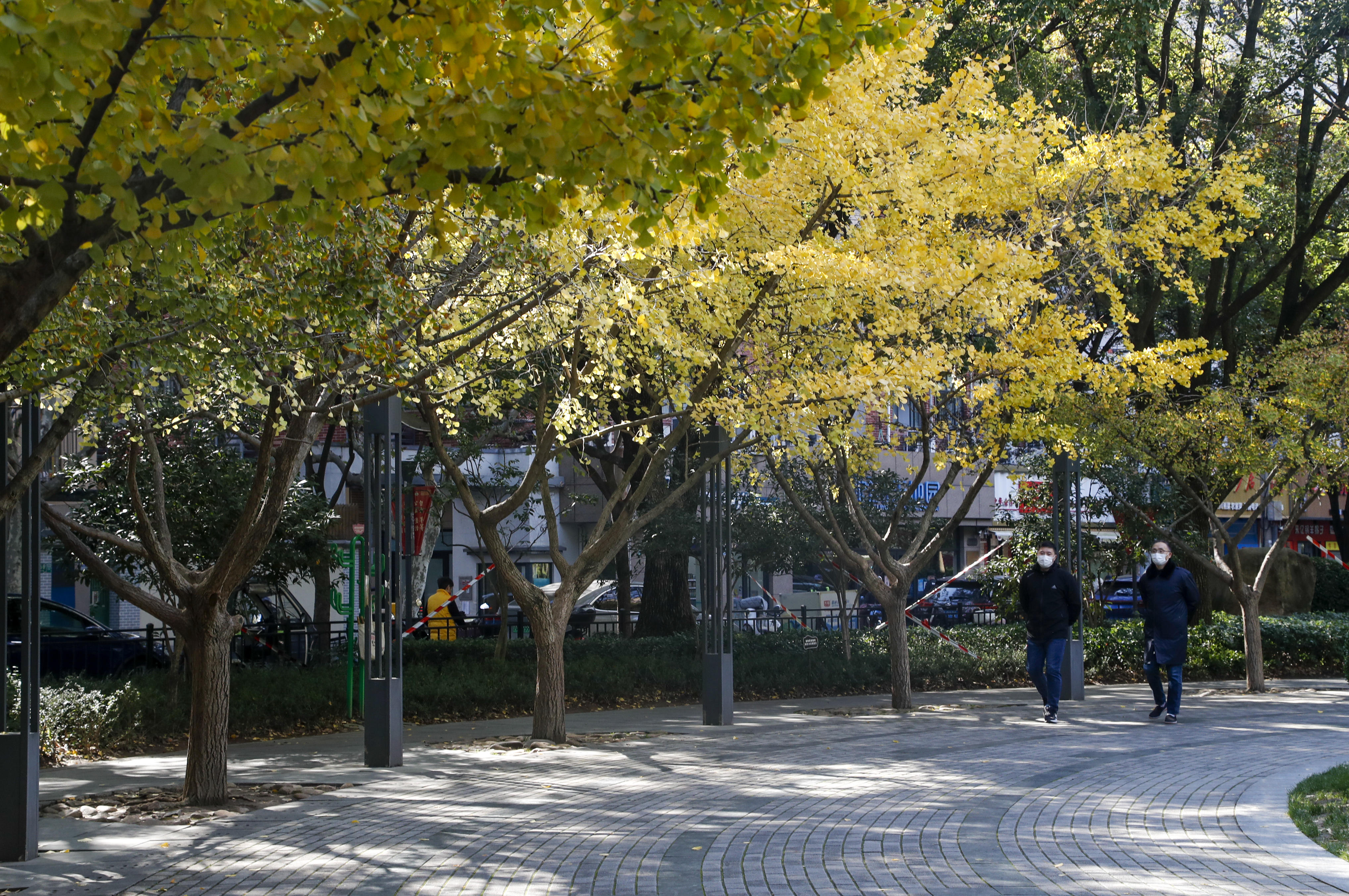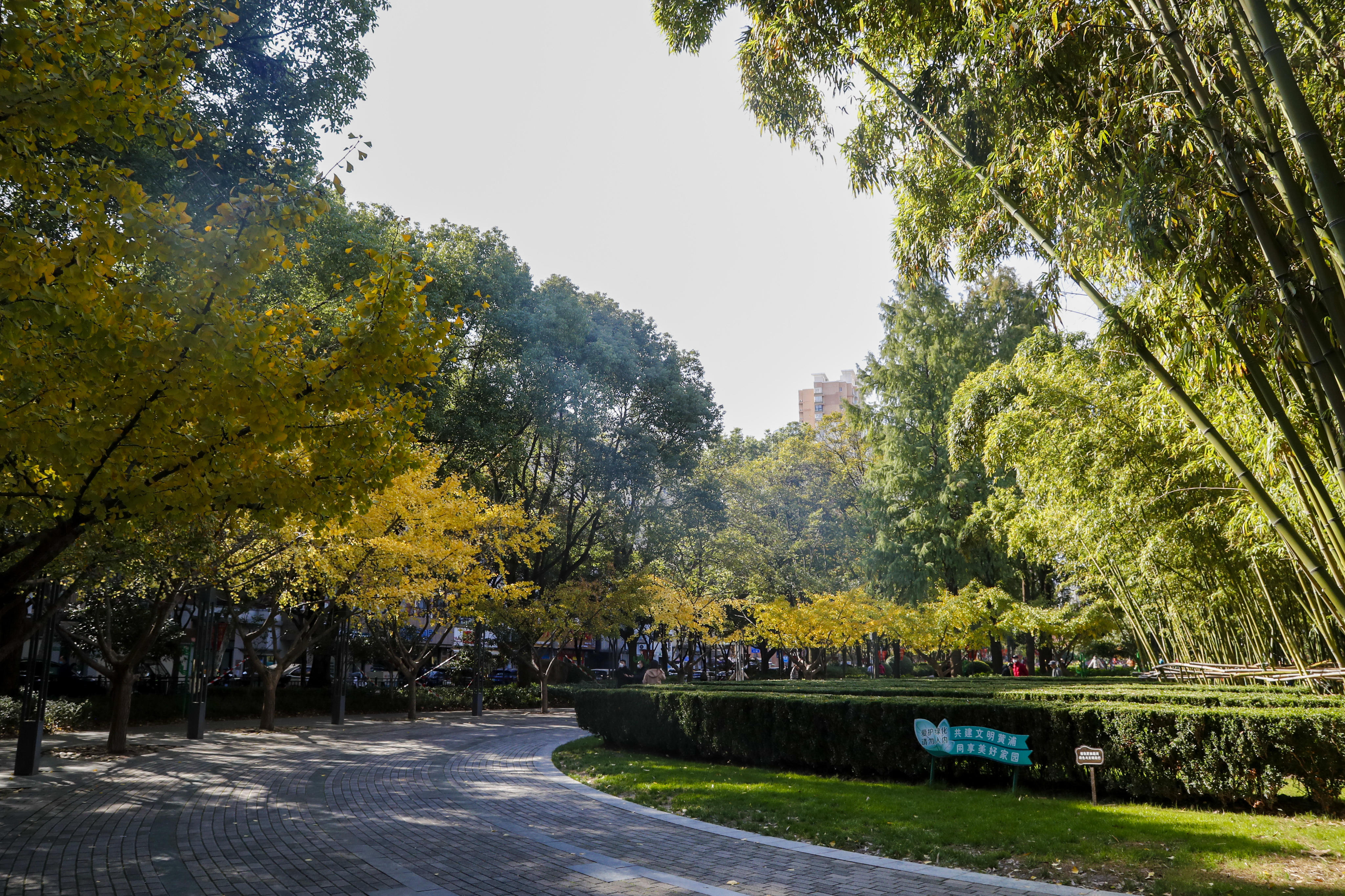 公园里一条并不长的银杏步道,是绝对的主角,秋末初冬,简直就像一幅油画,银杏明媚的黄,仿佛为这条路披上 “黄金甲”。