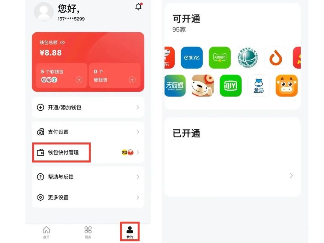 打开 “数字人民币APP”,点击“我的”-“钱包快付管理”,开通对应线上平台的钱包快付后,即可体验在线支付。