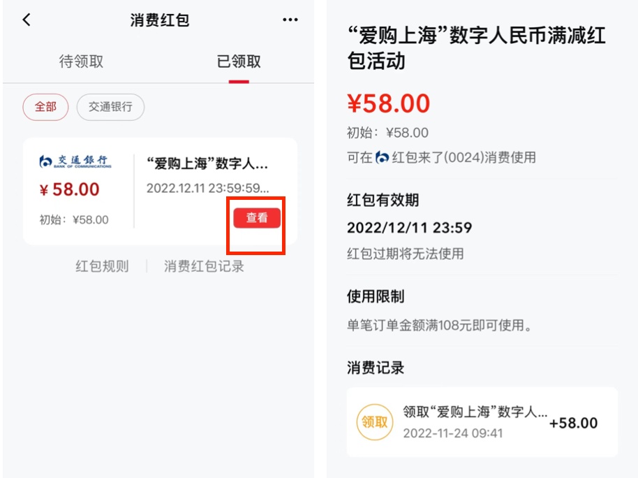 选择中签短信(或中签查询页面)中提示的运营机构开立个人数字钱包后,数字人民币满减红包将自动入账,点击“服务”-“消费红包”即可查询。