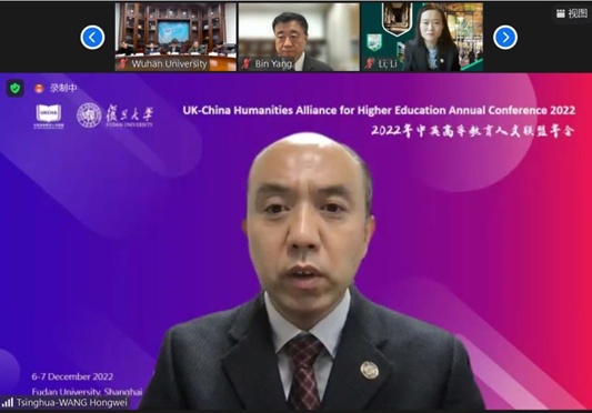 12月6日至7日,由中英高等教育人文联盟主办,复旦大学承办的2022年中英高等教育人文联盟年度大会暨执行理事会议以线上线下融合的方式在复旦大学召开。复旦大学校长金力、副校长陈志敏、埃克塞特大学校长丽莎•罗伯茨(Lisa Roberts)、副校长马克•古德温(Mark Goodwin)、副校长加里斯•斯坦斯菲尔德(Gareth Stansfield)、清华大学副校长王宏伟、清华大学副校长和中英高等教育人文联盟主席杨斌、武汉大学党委副书记沈壮海以及北京大学副校长汪博、上海外国语大学校长李岩松、北京外国语大学副校长孙有中等所有17所联盟成员高校的领导和资深学者等出席。