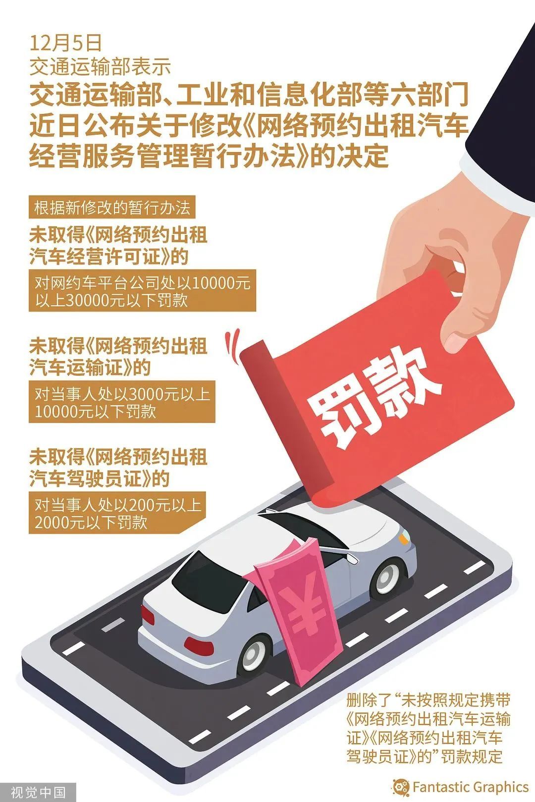 交通运输部、工业和信息化部、公安部、商务部、市场监管总局、国家网信办近日公布关于修改《网络预约出租汽车经营服务管理暂行办法》的决定,对未取得网络预约出租汽车运输证、驾驶员证从事网约车经营活动等行为的罚款数额予以下调。