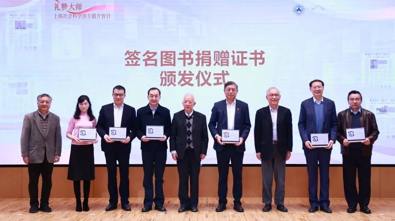 随后,还举行了“上海社会科学馆展陈资料征集活动”签名学术著作捐赠仪式。书籍捐赠代表,上海社联副主席、上海师范大学副校长陈恒说:“社科大师全集的出版、向前辈大师的致敬、学术贡献奖的发布、捐书仪式的举行是上海社联的一大创举。这些仪式的背后,是上海社科界的理想与信念,是社科大师精神的传承和表达。”