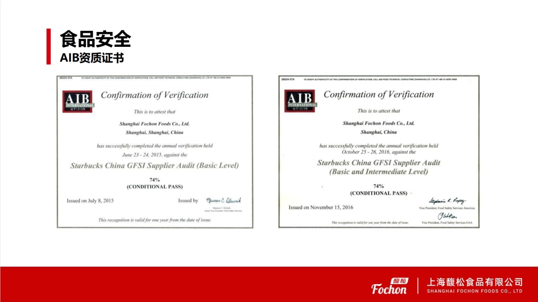 作为一家食品生产企业,食品安全和生产安全也一直是公司的重中之重。公司拥有FSSC22000、BRC质量认证体系证书以及AIB资产证书,“拥有这些证书就代表着我们的产品是能被全球所有商场所认证,食品安全这一关是没有问题的”,公司总经理王越说道。