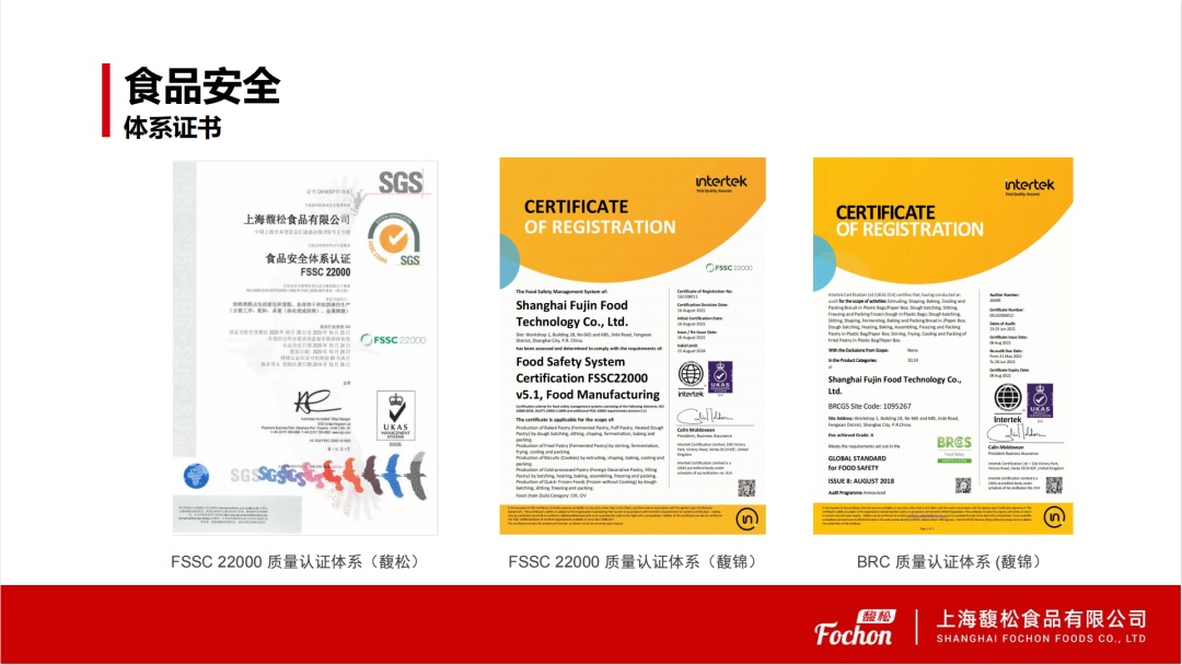 作为一家食品生产企业,食品安全和生产安全也一直是公司的重中之重。公司拥有FSSC22000、BRC质量认证体系证书以及AIB资产证书,“拥有这些证书就代表着我们的产品是能被全球所有商场所认证,食品安全这一关是没有问题的”,公司总经理王越说道。