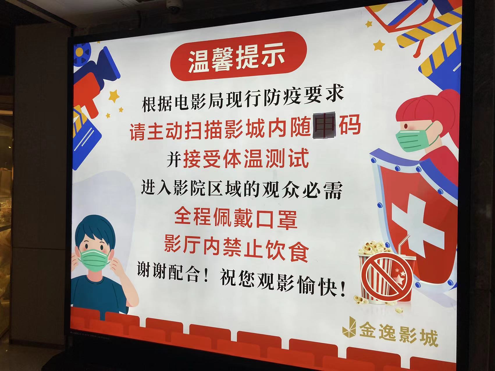 袁经理介绍说,“根据上海市最新防疫要求,现在,观众无需提供核酸阴性证明,但仍需扫场所码、绿码,然后配合我们员工进行体温测量,观影期间要全程佩戴口罩、禁止饮食。”