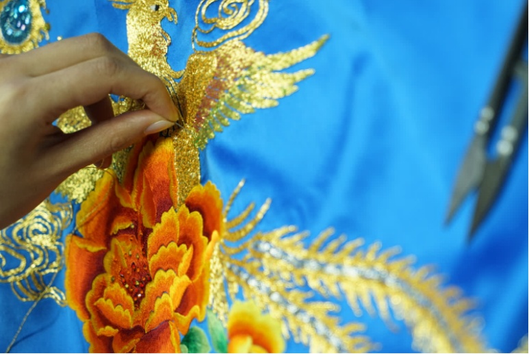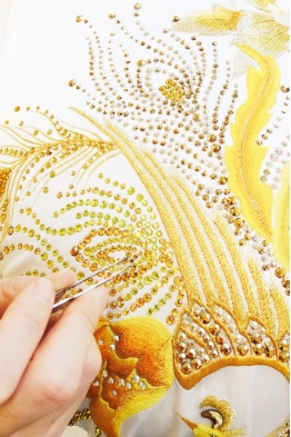 蔓楼兰的每一件旗袍都是原创出品,单制作就有78道工序, 通过工艺拆分和制作模板,对样品进行详细的工艺操作说明及验收标准,形成八大工艺特色,分别是:镶、滚、嵌、宕、盘、镂、雕、绣。即便不是所有的旗袍都会用到以上工艺,但每道工序都是由专业手工技艺师傅尽心缝制,再加上设计师的巧心构思,力求让每一件旗袍都能有它的点睛之笔。