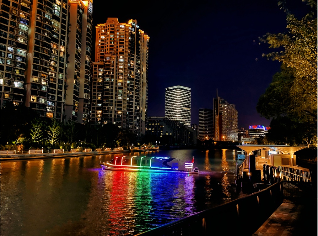 苏州河的游船为新能源纯电动游船,均通过高标准的国内客船入级检验;常态运行时全船声音可控制在60分贝以内;并可通过效果程序管理对灯光进行合理管控。
