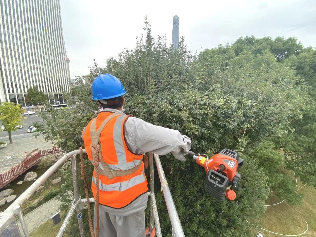 现场,在20个人的通力协作下,它成功完成了一次“美发”。人民公园绿化养护部园艺养护创新工作室在对白蜡树做好各项保护措施以及周围环境的安全保护措施后,进行了白蜡树造型的设计修整。利用蜘蛛型登高作业车为辅助,运用古树名木创新盆景式修剪技术,让百年白腊树重焕新光彩。“美发”后,只见它树形优美、盘根错节、层次分明,如同一组巨型盆景,在市区的公园、绿地中十分罕见,也成为外滩、新开河地区一道靓丽的风景线。