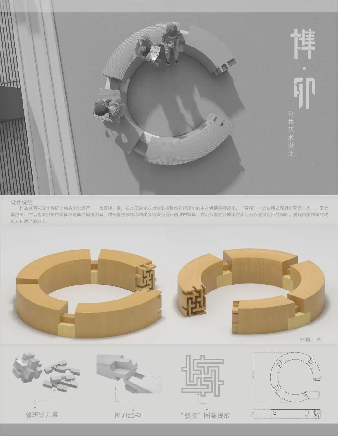作品灵感来源于传统非物质文化遗产——鲁班锁。攒,在木工的专业术语里指用榫卯把短小的木材纵横连接起来,“攒接”一词由明式家具研究第一人——王世襄提出。作品是汲取传统家具中经典的攒接图案,结合鲁班锁榫卯结构的特点而设计的城市家具。作品放置在城市公园中在满足公众使用功能的同时,展现中国传统非物质文化遗产的魅力。