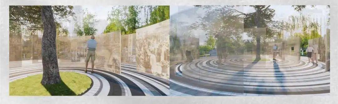这是一个“拼图”游戏,在复兴公园的若干场景中放置记忆的碎片,最后于大草坪交织成一个闭环。木环象征中式,钢环象征法式,两条环带追逐、交错、呼唤、汇合,形成四个不同的切片,不断地出现在游园的途中,为游客提供休憩的场所、唤起历史的追忆。虽经岁月洗礼,复兴公园不变的却是对人与自然、与场所永恒的关注。最后,在那片大草坪上,拼图形成闭环,公园的使命由此圆满。