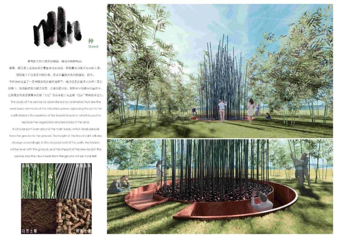 在大楼林立的都市中,我们习惯于撒下自然的种子,成为现代城市中的一处处景观。那么在广阔的山川田野中,我们是否可以撒下城市的种子,而这些城市种子又会冒出何种枝芽呢?装置主体用废弃的螺帽螺母置换大地土壤,钢筋置换绿色植被。外围设置一条圆弧形的步道直通地下,视线的高度随步道深度而改变,步道的最深处,视野水平线将于地面齐平,也将更加能感受装置中的新“土地”和从中破土而出新“枝芽”带来的冲击力。