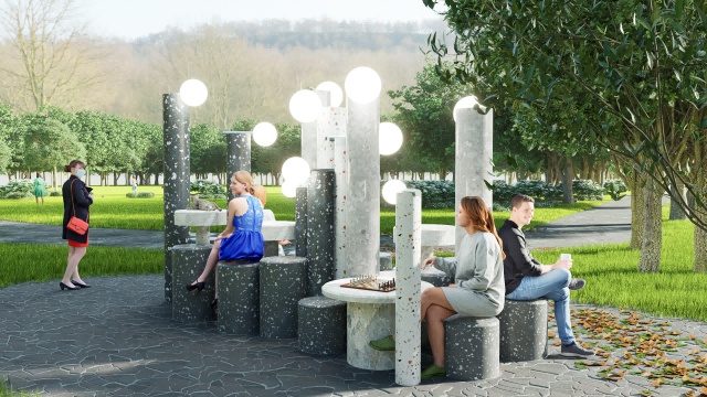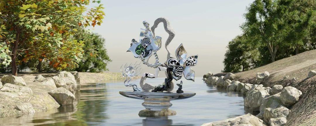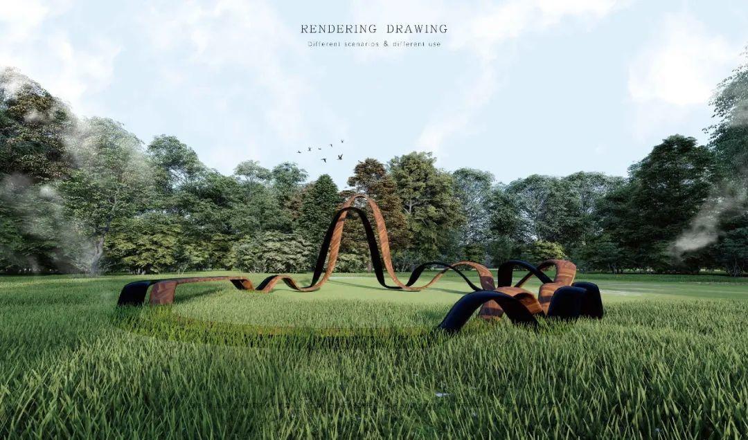 设计师将禅意植物、山石与欧普纹样结合,形成多元、包容的现代景观雕塑。并缀以从中国古画中拾取意象——联珠、星体,寓意“繁华不断涌现”之景。两株奇想花茎的交置、循环体现一种哲学上的循环、互生。装置底座可坐可倚,也可在附近打卡拍照、观赏,也可拿起鹅卵石在座位上进行“叠石”活动,人与景融为一体。将文化与绿色设计、绿色材料结合,成为现代人群的心理充电处。