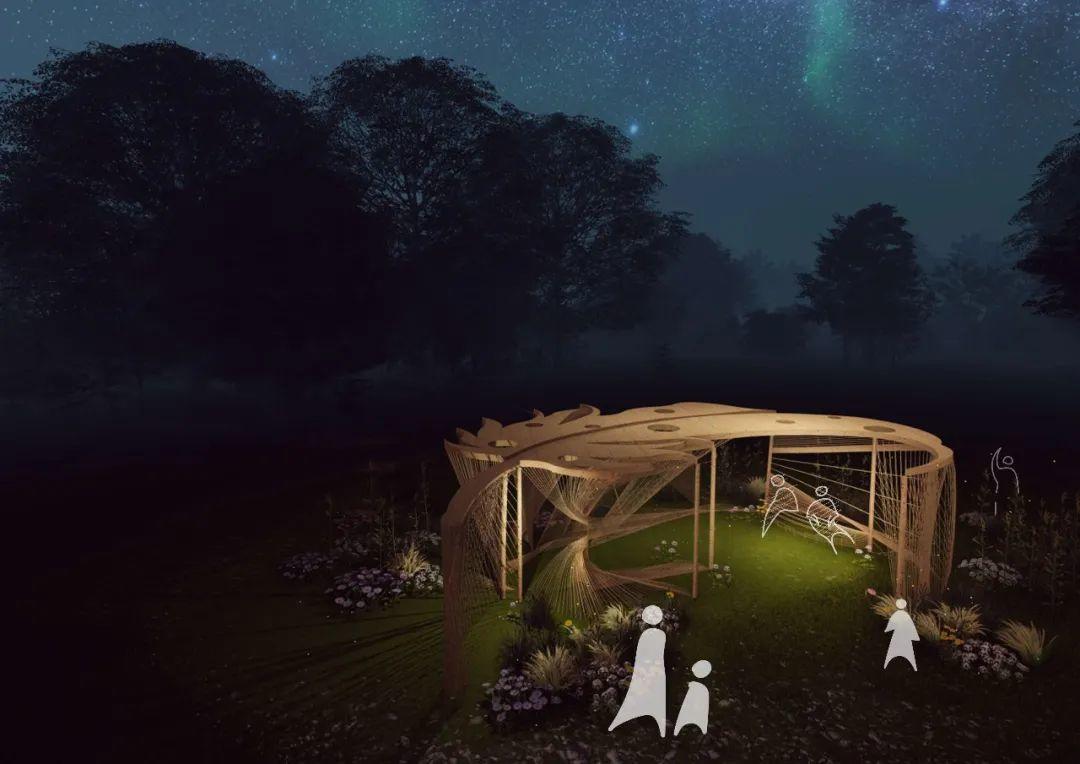 作品为位于上海黄浦区环复兴公园内的景观亭,可观赏可停留休憩。整个景观亭以法国代表性元素——羽毛为出发点进行构思,提炼羽毛外形为异形顶面,材质为可弯曲变形的生态竹子,以点、线、面的形式构成景观亭的各个部分。通过虚与实的结合,丰富了景观亭的空间层次感,也提升了空间的趣味性,通过中西方元素(竹子、羽毛)的结合,亦体现了景亭文化包容性及多样性,同时结合周围环境设计,成为当代热门的网红打卡胜地。