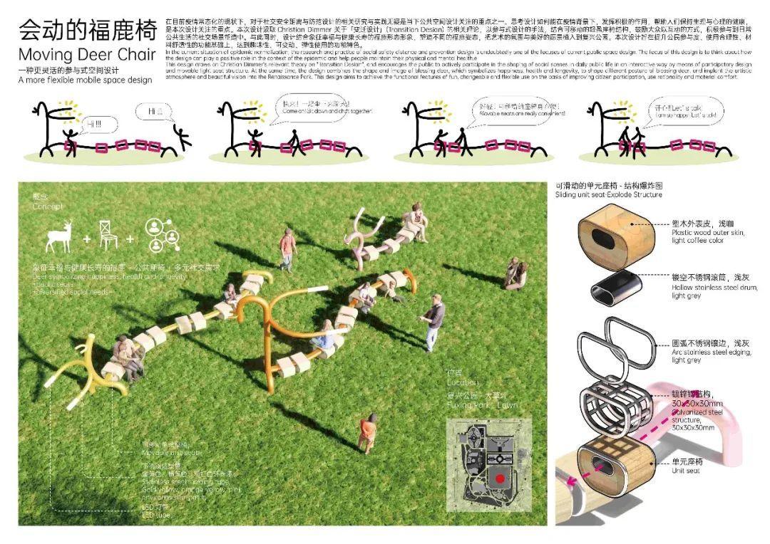 设计汲取 Christian Dimmer 关于「变迁设计」(Transition Desian) 的相关理论,以参与式设计的手法,结合可移动的轻盈座椅结构,鼓励大众以互动的方式,积极参与到日常公共生活的社交场景塑造中。同时,设计结合象征幸福与健康长寿的福鹿形态形象,塑造不同的福鹿姿态,把艺术的氛围与美好的愿景植入到复兴公园。设计旨在提升公民参与度、使用合理性、材料舒适性的功能基础上,达到趣味性、可变动、弹性使用的功能特色。