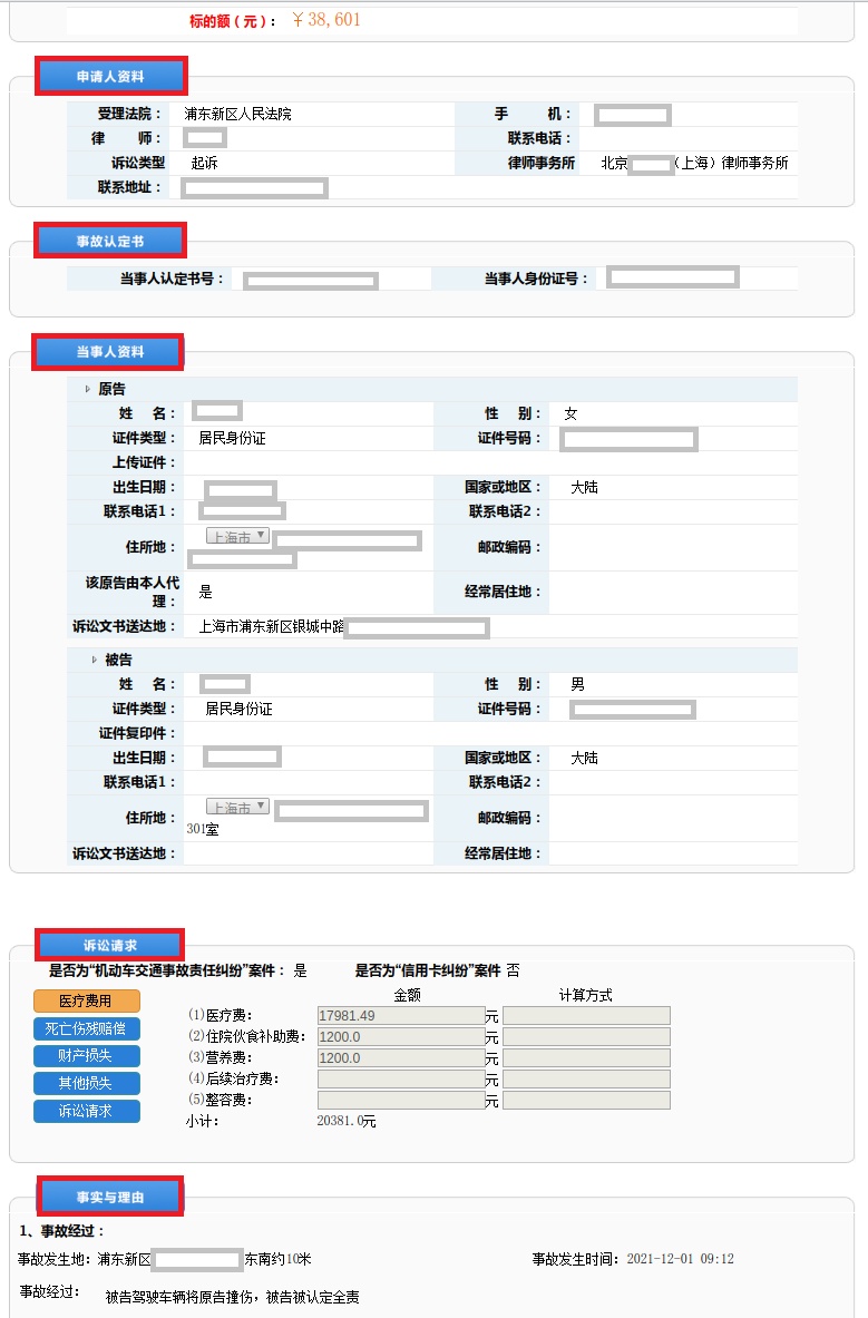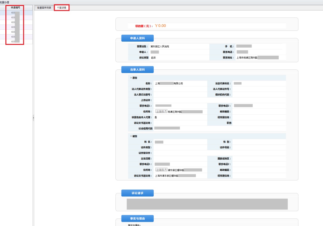 在网上立案页面点击具体申请编号后面的【办理】或【查看】,直接进入案件要素式信息界面。界面可全面清晰地展示案件详细信息,立案法官可依序核对申请人信息、当事人信息、诉讼请求、事实与理由、管辖依据等。