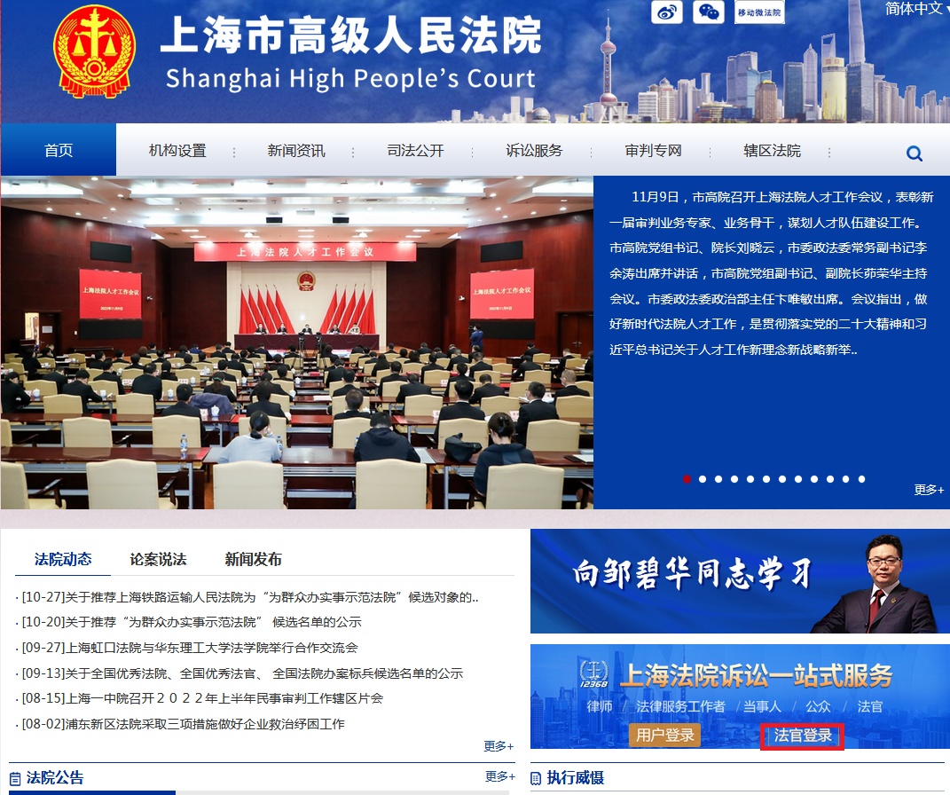 一是互联网。通过浏览器进入“上海市高级人民法院”官网,在“上海法院诉讼一站式服务”模块下,点击【法官登录】进入上海法院办公办案平台系统。