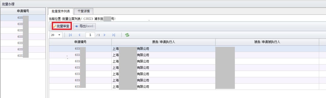 通过个案详情,可对案件进行立案审查,因批量案件当事人一方均相同,故一方当事人信息无需重复核对。若其中个别案件不符合立案登记的形式要件,可单独点击【退回】。若均符合立案登记的形式要件,可点击【批量审查】,进行批量登记立案操作,无需个案分别登记。