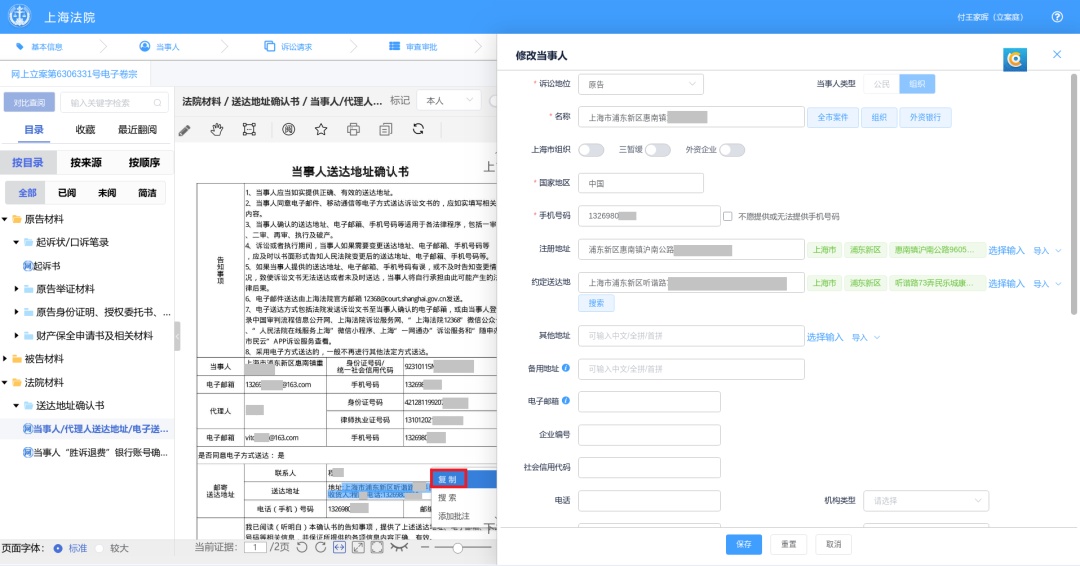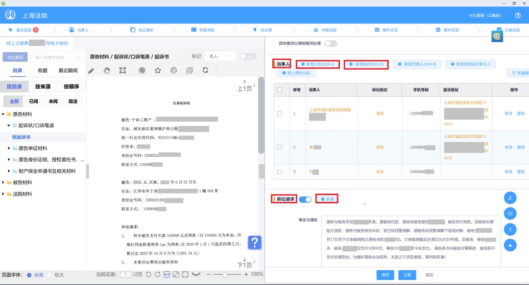 注意:登记立案时可进行左看右写的模式(左边是电子材料,右边是案件输入信息界面),同时当事人信息、诉讼请求信息均有新增功能。