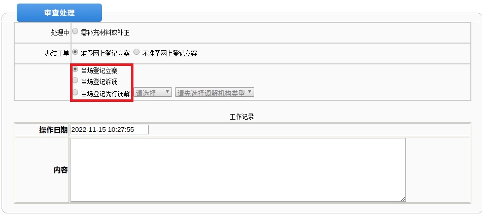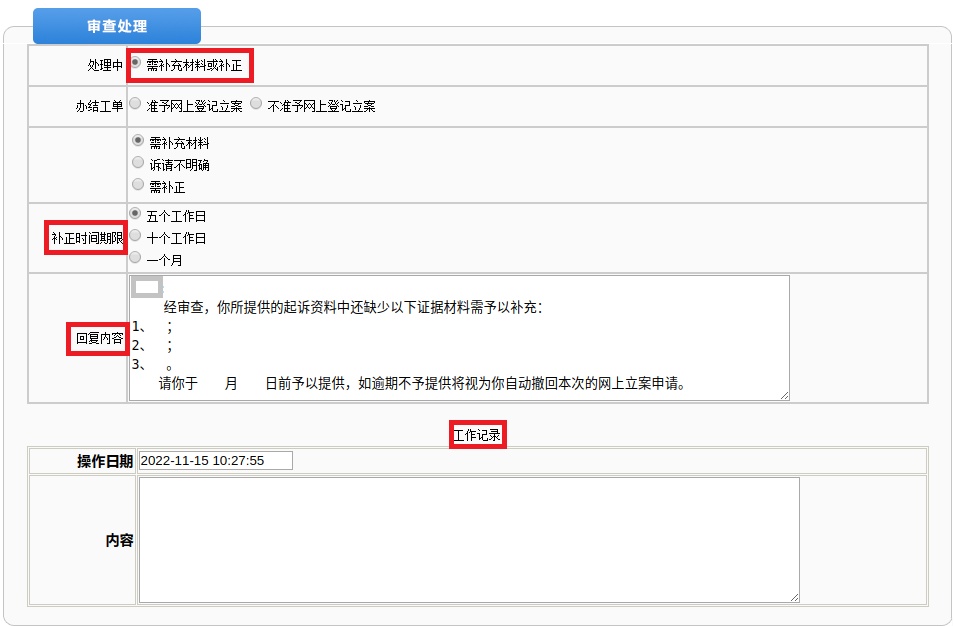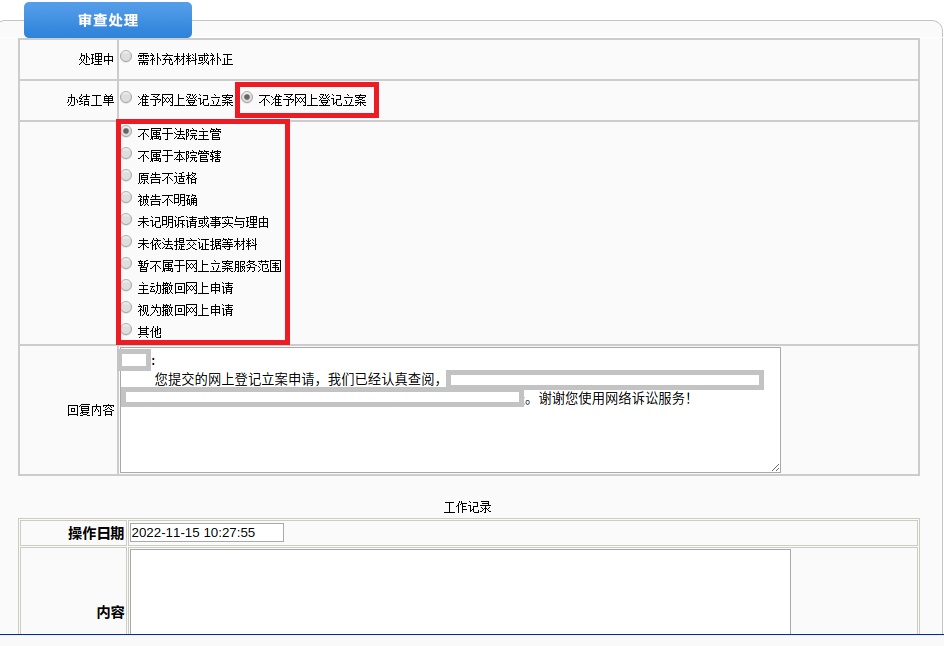 注意:为了全程留痕,立案法官可在工作记录模块填写案件审核详细情况。