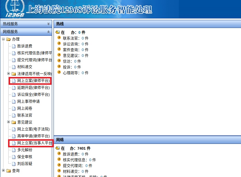 二是政务外网。使用身份认证棒登录政务外网综合信息系统平台,点击【12368平台】进入上海法院12368诉讼服务智能处理系统。在左侧显示模板内可分别进入网上立案(律师平台)和网上立案(当事人平台)。