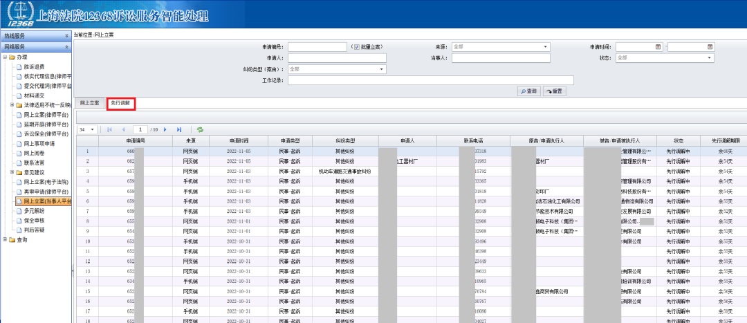 先行调解平台已嵌入网上立案平台,立案法官在上述模块可查询案件状态(待先行调解、先行调解中、先行调解结束)。