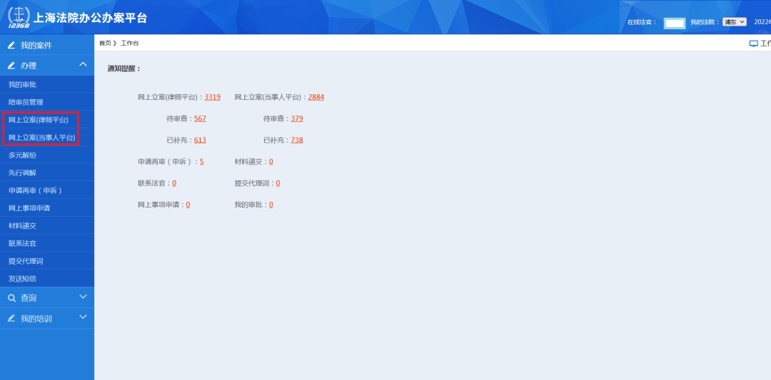 在办理菜单下,立案法官可对网上立案(律师平台)和网上立案(当事人平台)中的相关案件进行登记立案审查。