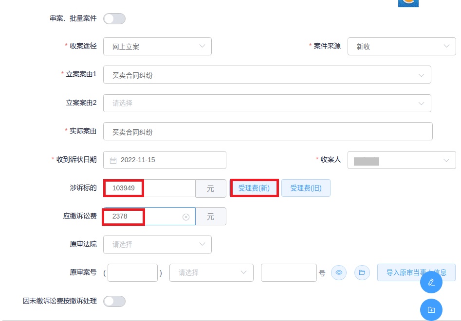 ➤在输入案件涉诉标的额时,点击【受理费(新)】,即可生成对应诉讼费金额。
