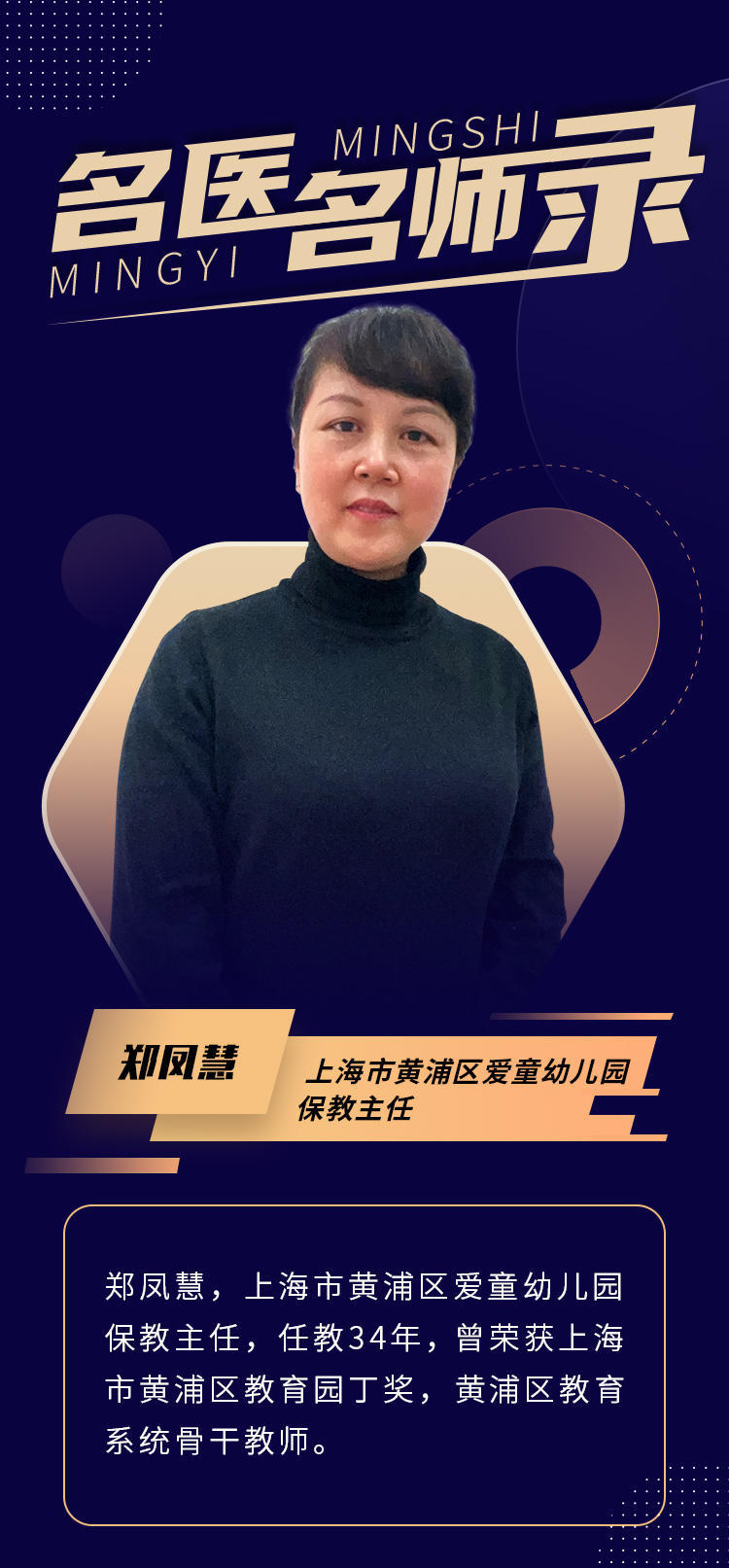 郑凤慧,上海市黄浦区爱童幼儿园保教主任,任教34年,曾荣获上海市黄浦区教育园丁奖,黄浦区教育系统骨干教师。