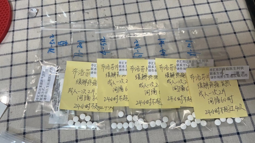12月21日晚上,从外地赶回松江的吴经纬立即给亭汇居委会送去了200粒布洛芬和200粒对乙酰氨基酚。居委会根据排摸的情况,将药品按每人4片进行拆分并重新打包。考虑到部分老年居民不擅长使用智能设备,且居民区热线高峰时段可能占线,汤肖燕和工作人员还在每袋药中放上一张写有辖区家庭医生电话号码的纸条,并嘱咐老人们用药前可以拨打家庭医生电话,按医嘱服用。