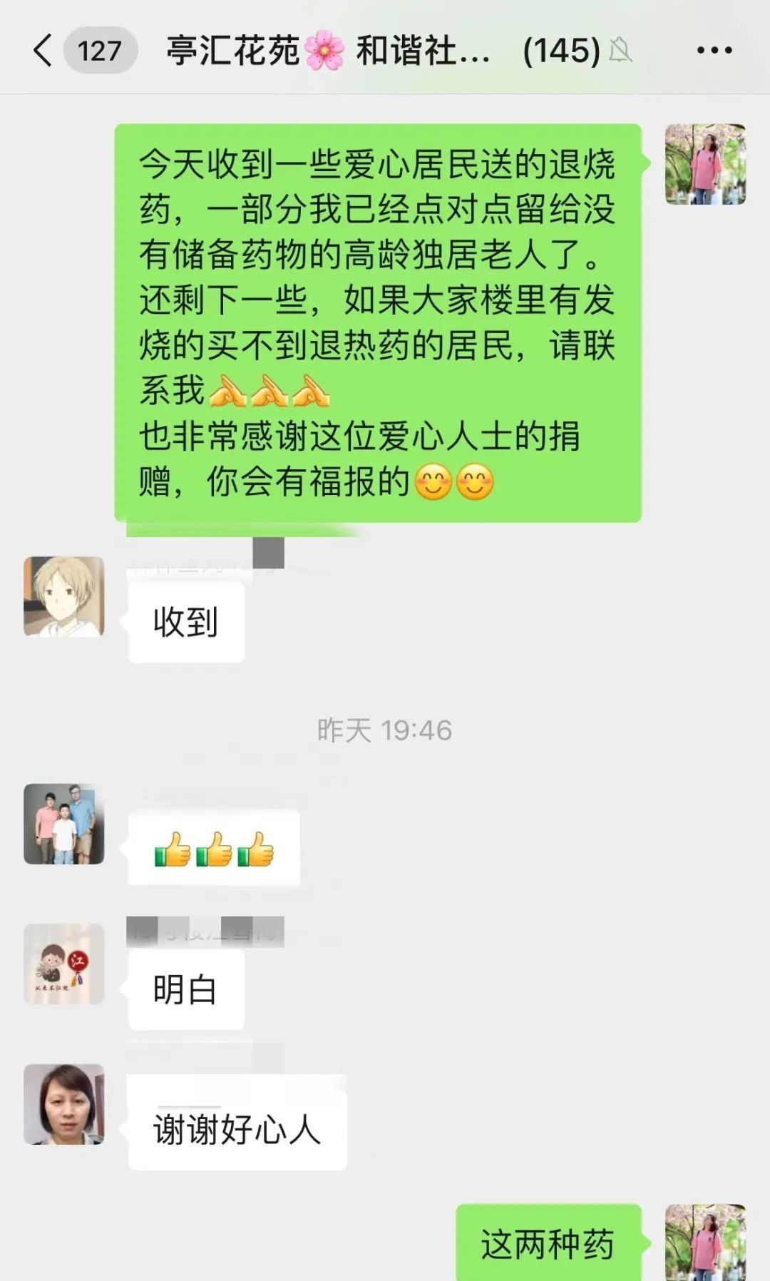 12月20日晚上,吴经纬给汤肖燕发来微信,他表示自己在外出差时采购了一批退烧药品,想捐赠给居民区有需要的家庭。据悉,吴经纬一直是亭汇居民区的热心人,早早就加入了居民区楼组长微信群,且以志愿者的身份多次在社区帮忙。近期,他在外地出差,发现当地药店的退烧类药品供应充足,于是立刻想到了在楼组长群内看到,汤肖燕曾询问谁家有多余的药品可以拿出来给有需要的家庭应急。吴经纬立刻联系了汤肖燕,表示自己可以在当地药店购买一批退烧类药品带回去。“正好能够买到,我只是举手之劳。”吴经纬谦虚地说。