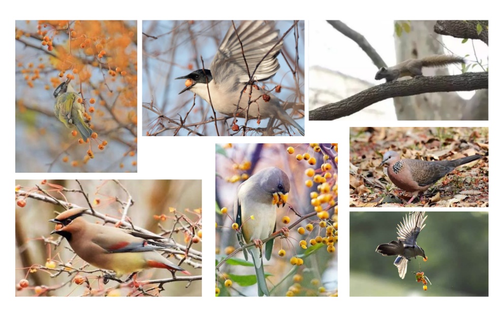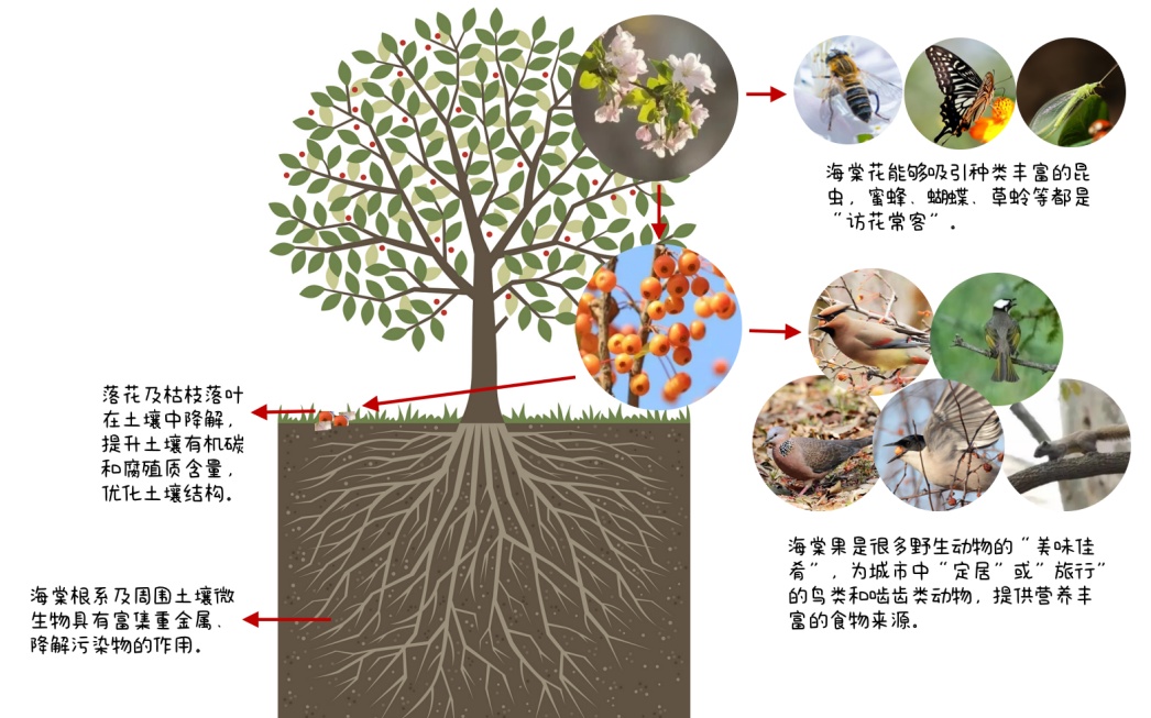 花园中丰富度高且稳定的植物物种群落,能促进固碳释氧、降温增湿、水分利用等作用。同时,品种丰富的海棠能够吸引蜜蜂、草蛉等访花昆虫;果实能够为野生动物提供越冬的食物资源;树下隐蔽环境能为小动物提供躲避空间,且后期养护中将减少农药化肥使用,呈现自然友好、生机盎然的生态环境。