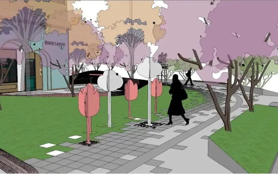 花园的植物配置方面,选用海棠为特色花卉,搭配无患子、金桂等植物,展现“玉堂富贵”“吉祥如意”的美好寓意。中层塔形植物似山峦,组团之间流动的草坪似云雾,高低起伏的艺术折板延绵展开,平坦的硬质场地变成立体绿色空间,宛如一笔勾勒,行云流水。