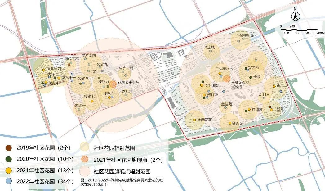 第三个层面,实现项目逐步落地。2022年在东明路街道完成了34个社区花园,自2019年起累计已完成59个社区花园,同时完成赋能培育民间发起的社区花园共60余个。