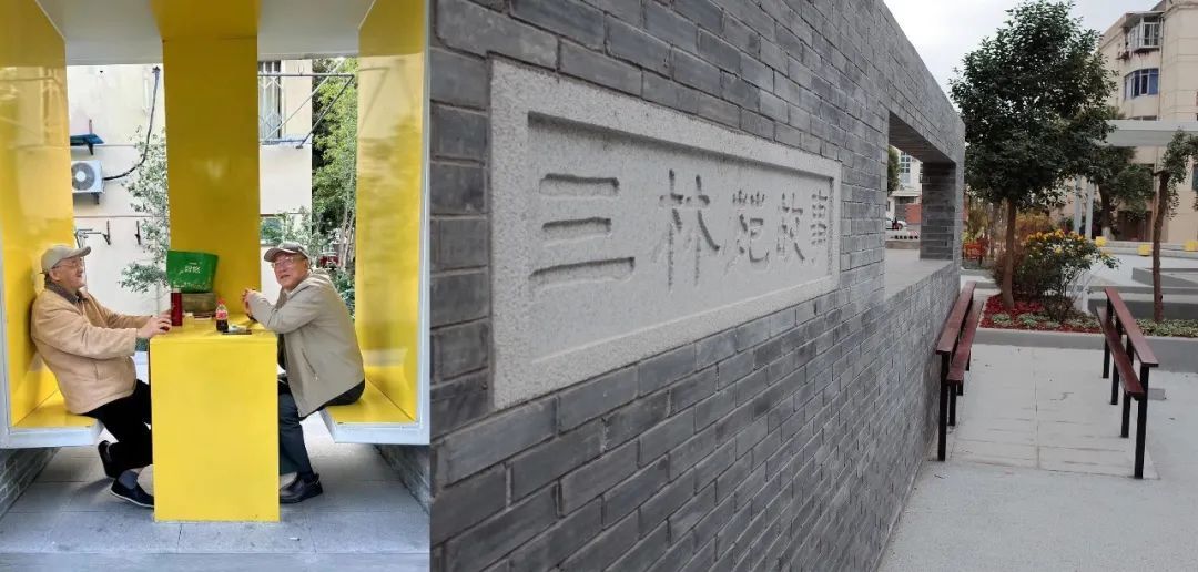 在社区调研和设计方案与居民的沟通过程中,设计团队收获了来自社区里的居民曹叔叔的“礼物”:一套九子游戏和三林苑故事的题字。这份礼物也融入了场地设计中,成为了各个空间的节点名称。